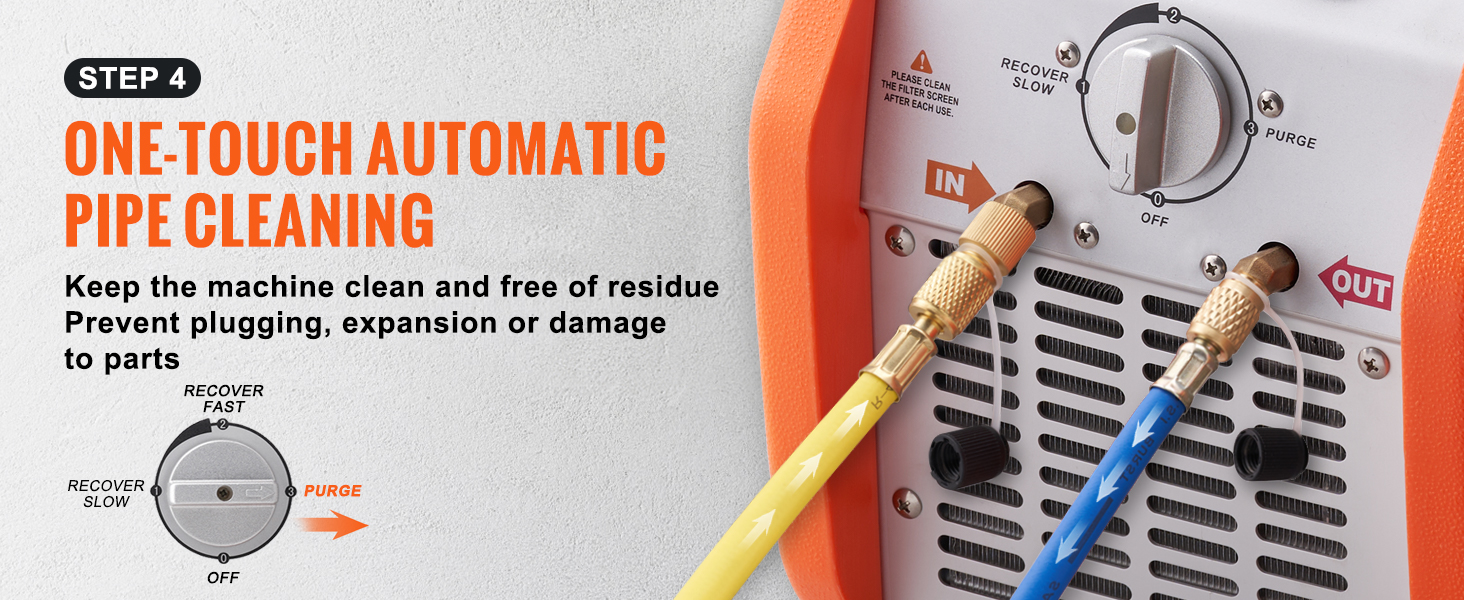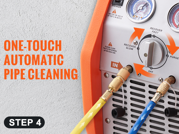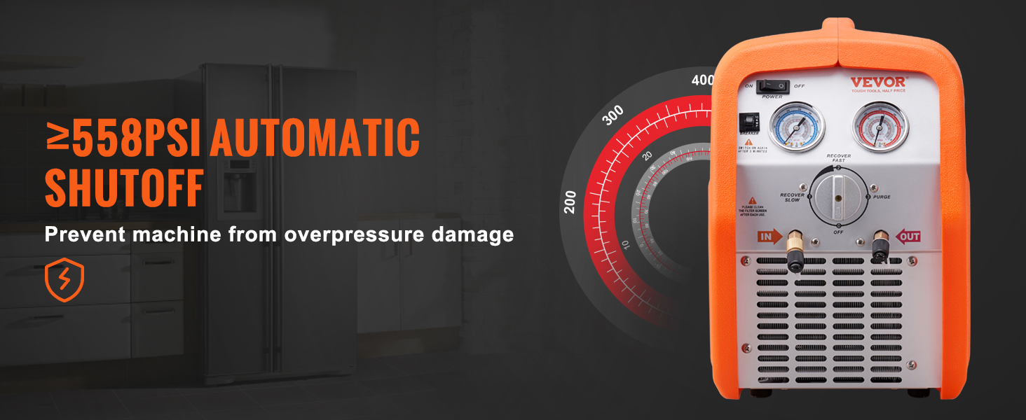 The 1 HP refrigerant recovery machine also has a built-in current overload switch to prevent damage caused by excessive current.