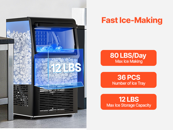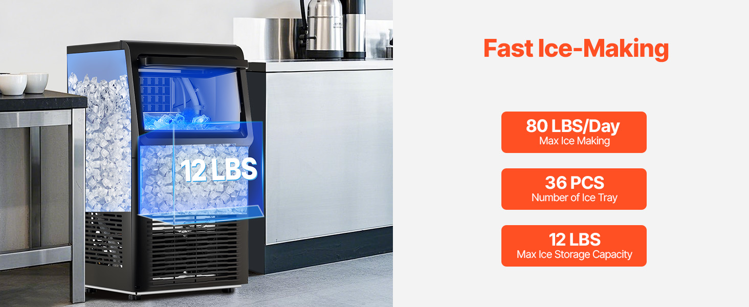 VEVOR Commercial Ice Maker Machine, 80lbs/24H Ice Maker Machine with 12lbs Storage Capacity, 36 Ice Cubes in 15 Minutes, LED Digital Display Freestanding Self-Cleaning for Bar Office Restaurant