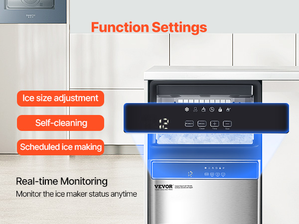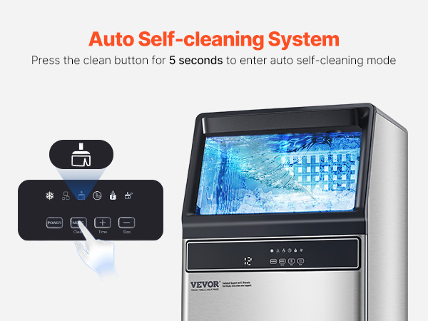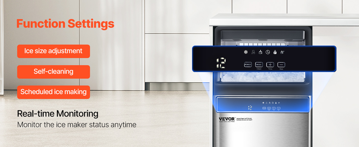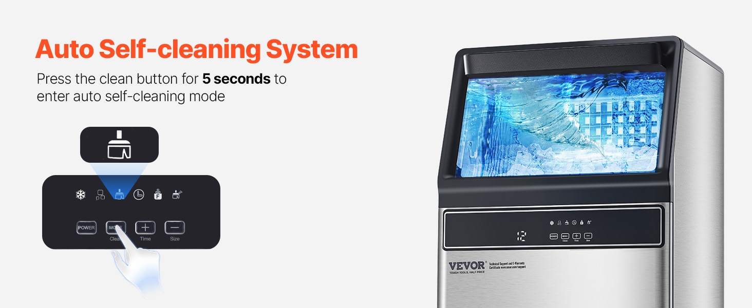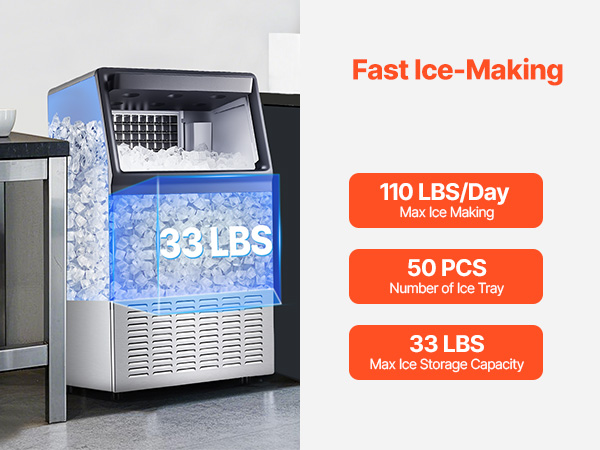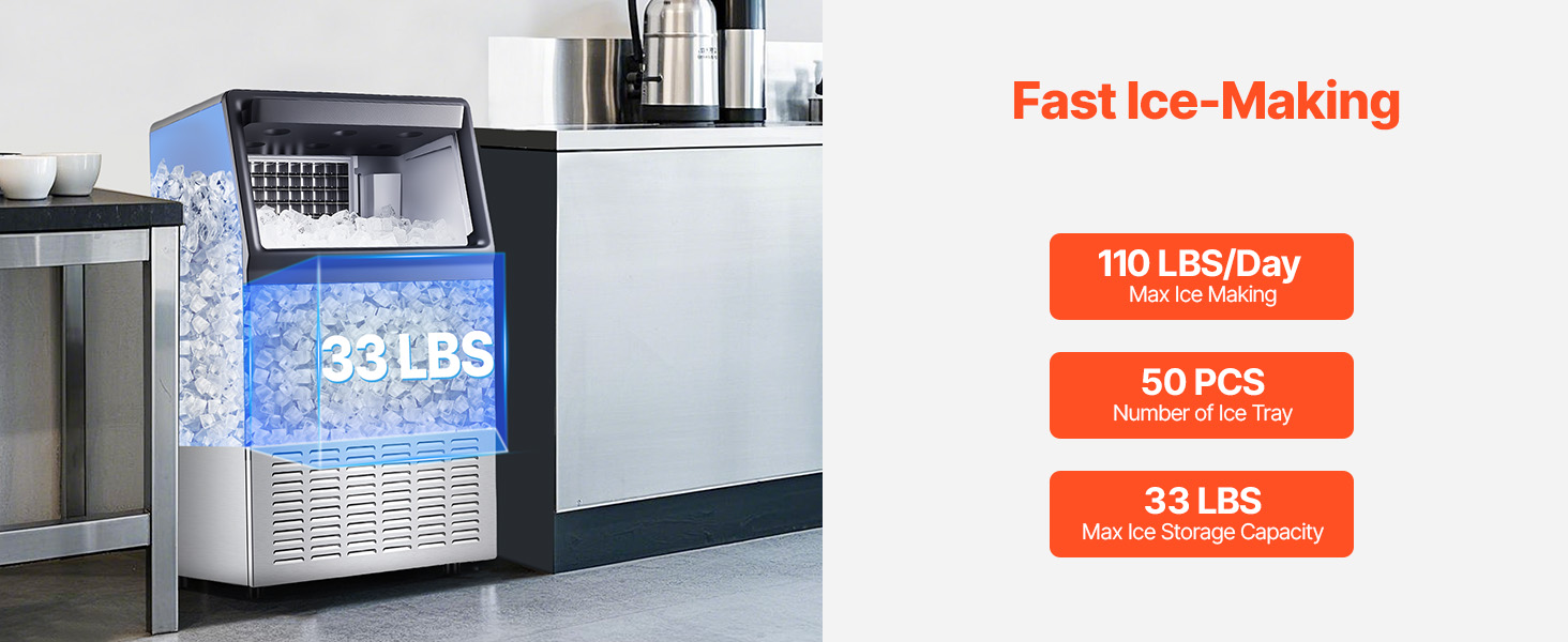 VEVOR Commercial Ice Maker Machine, 110lbs/24H Ice Maker Machine with 33lbs Storage Capacity, 50 Ice Cubes in 15 Minutes, LED Digital Display Freestanding Self-Cleaning for Bar Office Restaurant