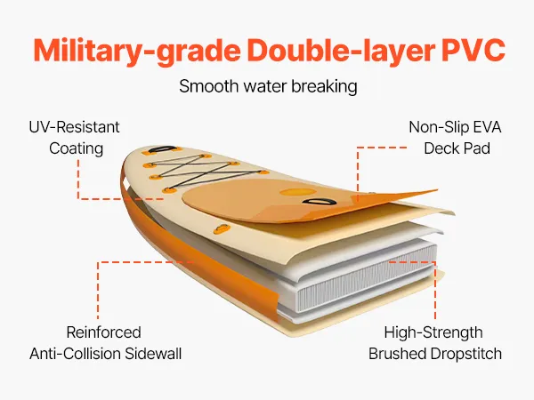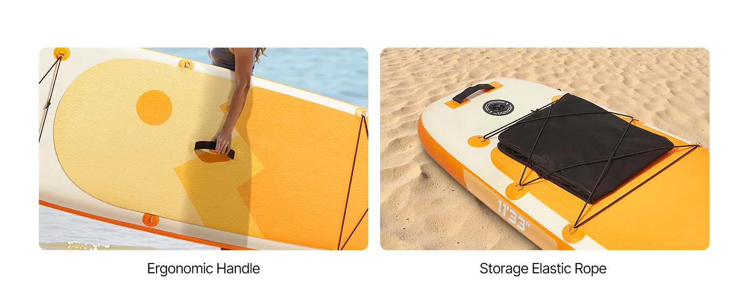 Made with new ultra-light military-grade dual-layer PVC material, the stand up paddle board's interior features high-quality brushed technology to increase board rigidity, making it less prone to deformation or damage. The ergonomic handle makes it easy to carry with one hand.