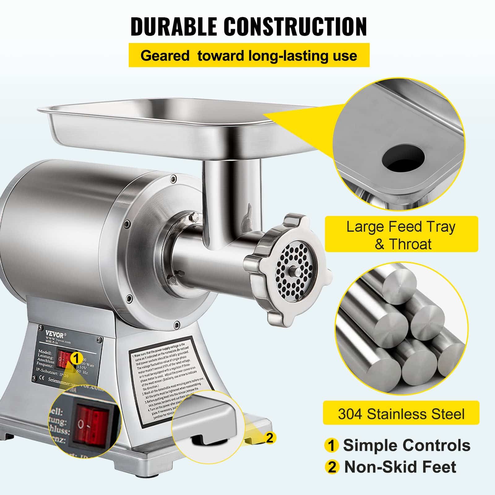 The 1100-watt high-power motor with 193r/min rotating speed, allows grind approximately up to 150kg/330lbs of meat per hour, greatly improving the efficiency of meat grinding.