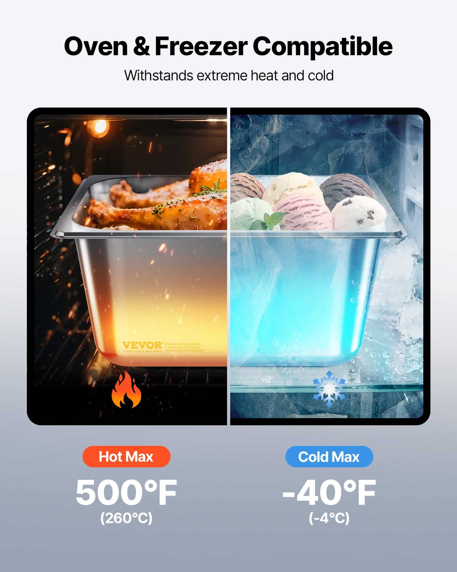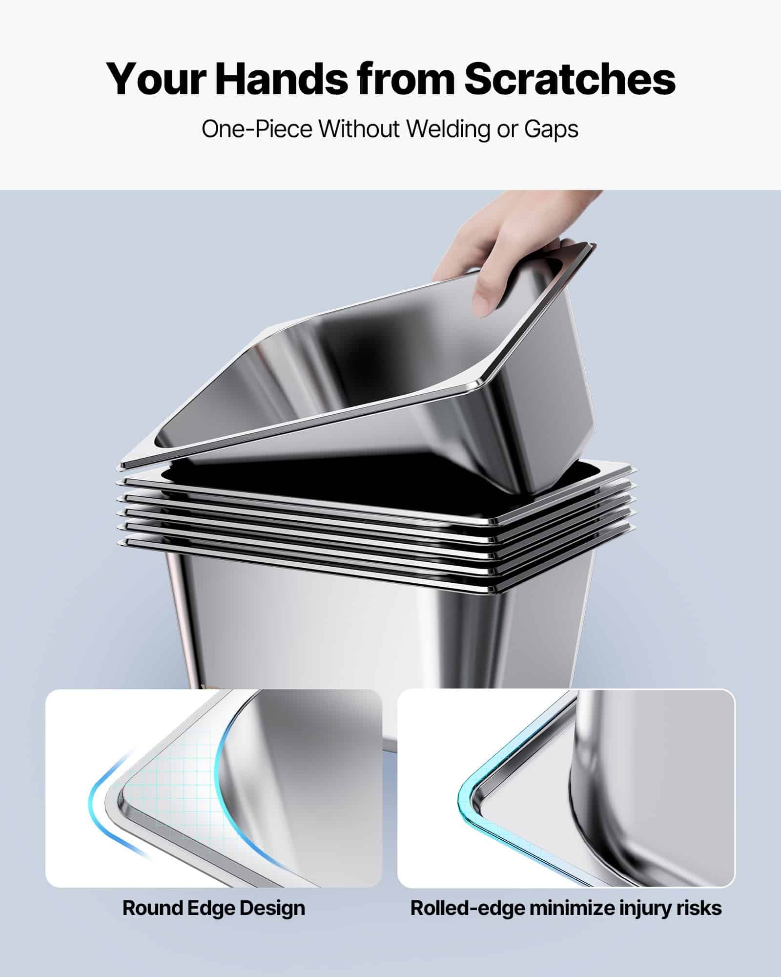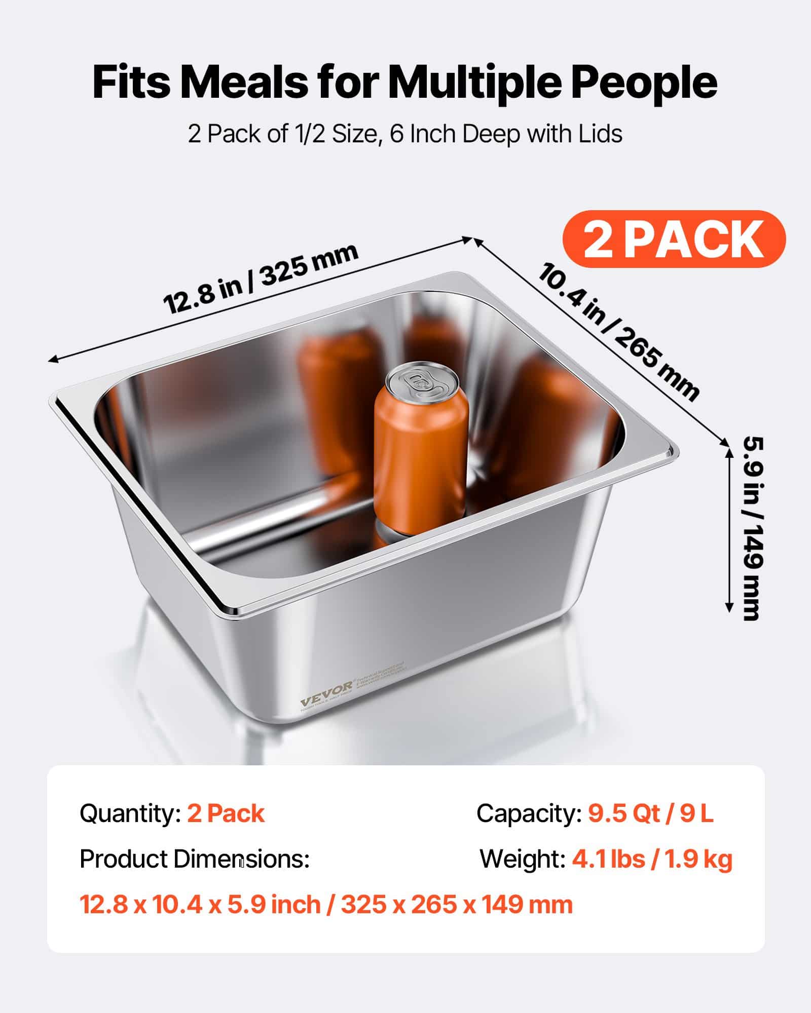 This steam tray is made from commercial-grade 22-gauge SS201 stainless steel, offering strength and rust resistance. The 1/2 half-size pan, 6 inches deep, 2-pack with lids design meets daily cooking needs and is perfect for cooking, storing, and displaying food such as meats, vegetables, fruits, and even ice cream.