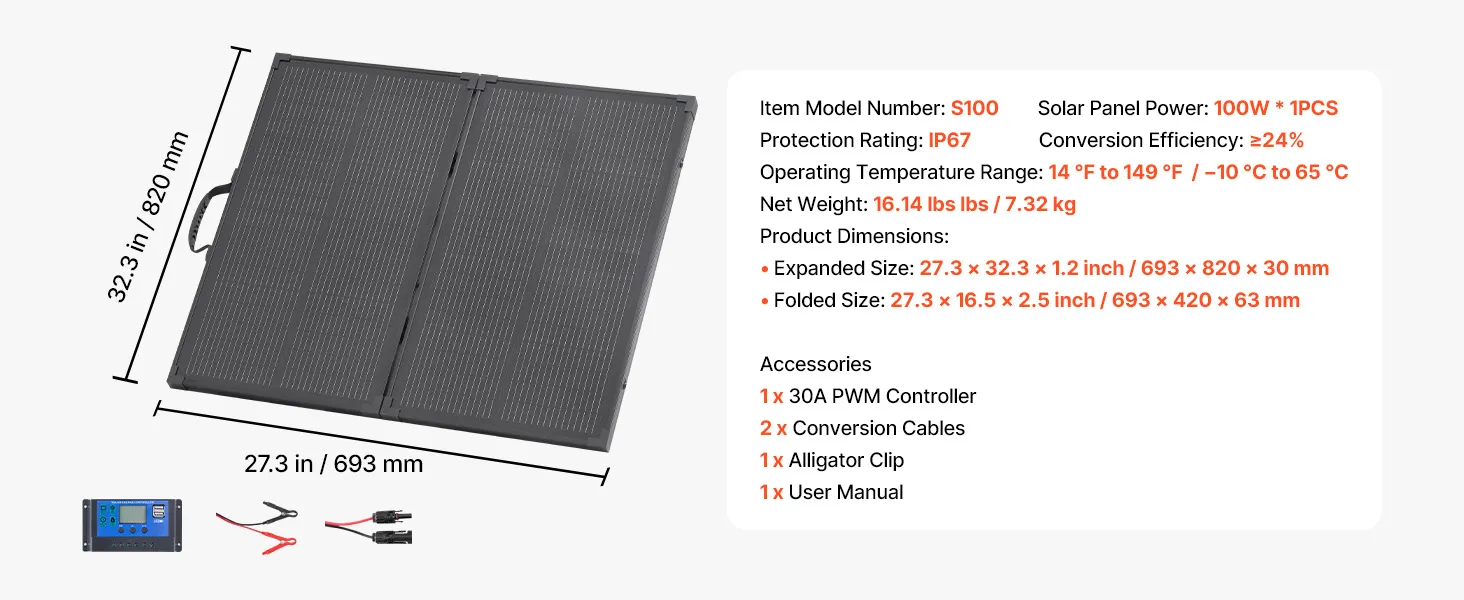 VEVOR 100W Foldable Solar Panel with Frame, 16BB N-Type Portable Monocrystalline Solar Panel Charger 24% Efficiency, IP67 Waterproof with 30A PWM Controller & MC4 Output for Camping, Hiking, RV Trips