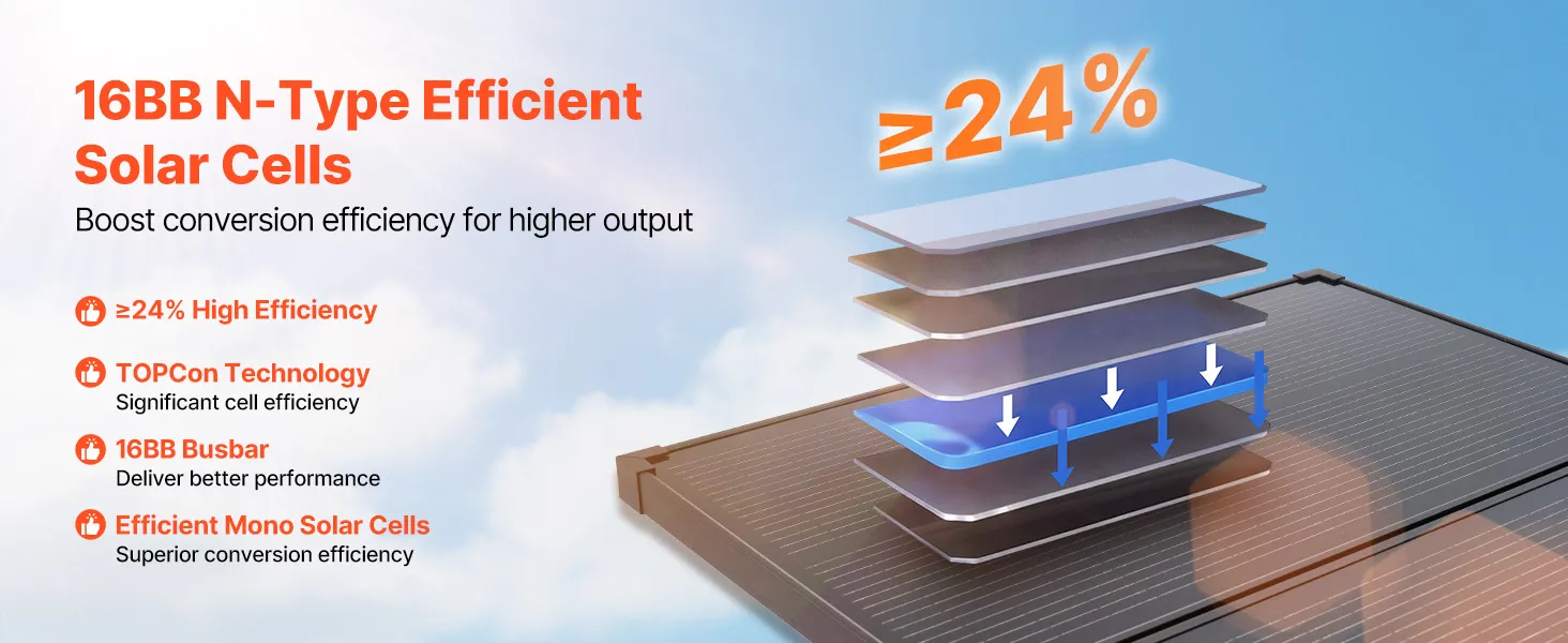 Featuring 16BB N-Type high-efficiency monocrystalline solar cells and ≥24% conversion efficiency, this solar panel captures more sunlight and ensures steady, consistent energy output to keep your devices powered.