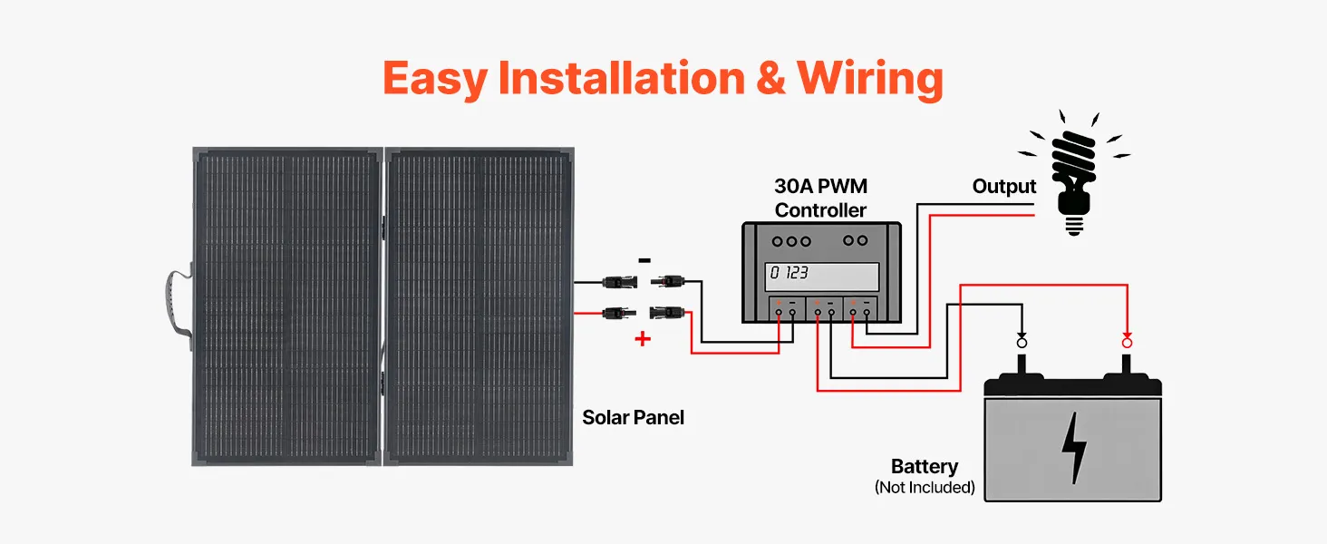 Our monocrystalline solar panel features a stable MC4 output, a 30A PWM controller, and alligator clips, allowing easy connection to your batteries and ensuring stable, consistent power output.