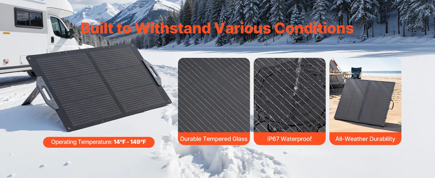 Built with an IP67 protection rating and a durable frame, this solar panel performs reliably from 14°F to 149°F (−10°C to 65°C), ensuring stable and long-lasting performance in various outdoor environments.