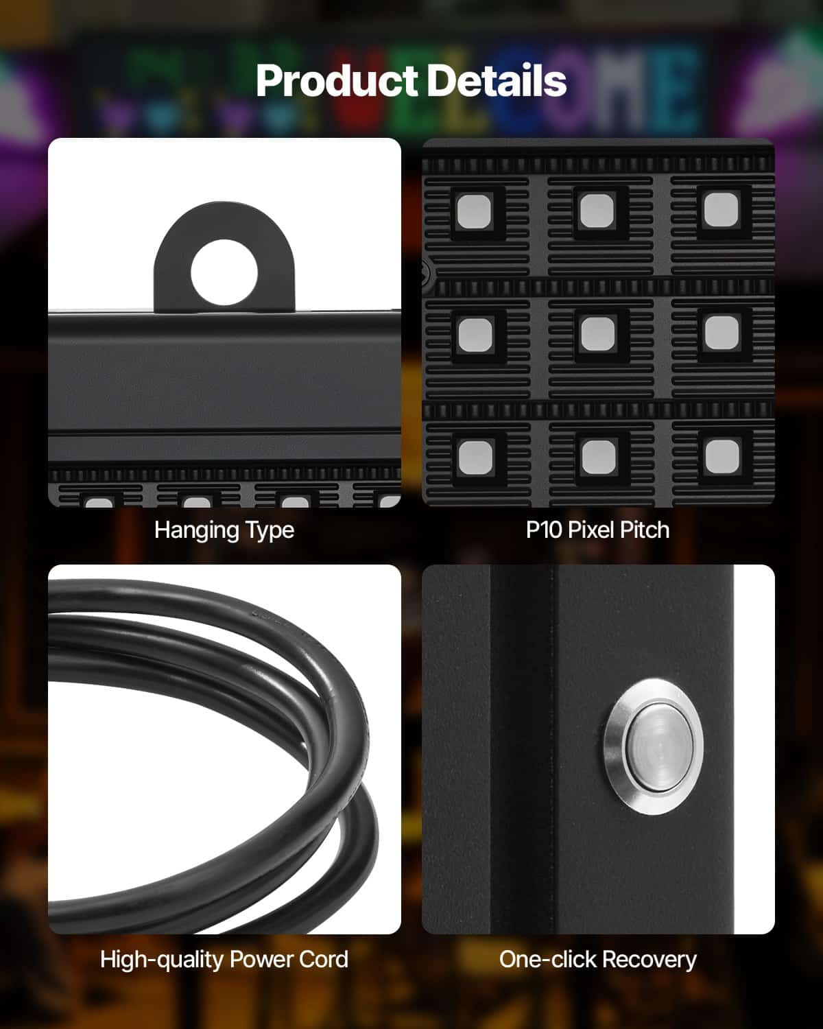 Supports scrolling text, times, and GIF. Colorful, dynamic text displays catch the eye of passersby.