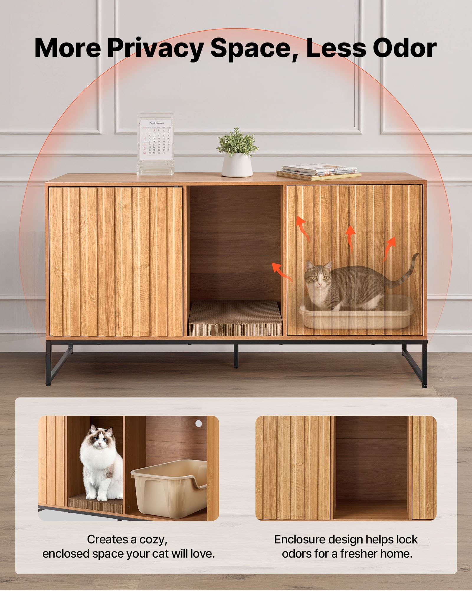 The cat litter box furniture features an enclosed structure, which combines with hidden ventilation holes to block odors while maintaining air circulation. It creates a closed and private toilet space for your cats.