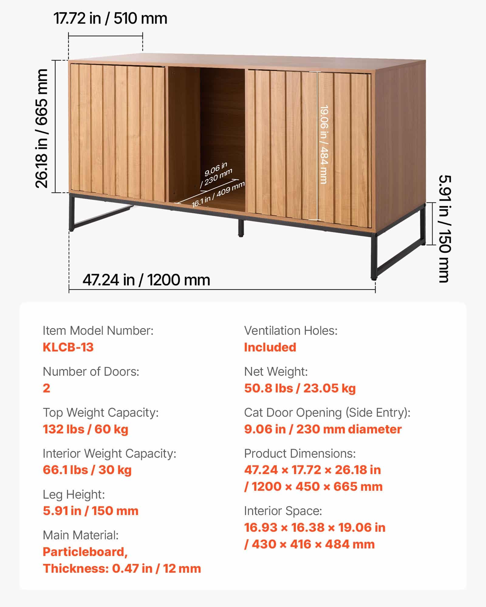 - 47.24 x 17.72 x 26.18 in / 1200 x 450 x 665 mm
