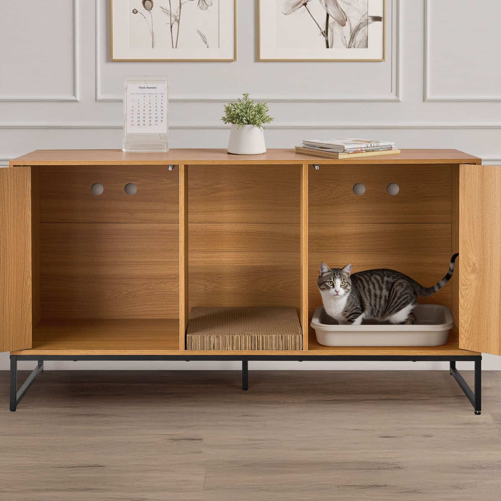 This hidden cat litter box cabinet flexibly transforms into a Nordic-style side cabinet or TV cabinet. It elegantly blocks odors and cat litter spills while keeping your home clean and stylish.