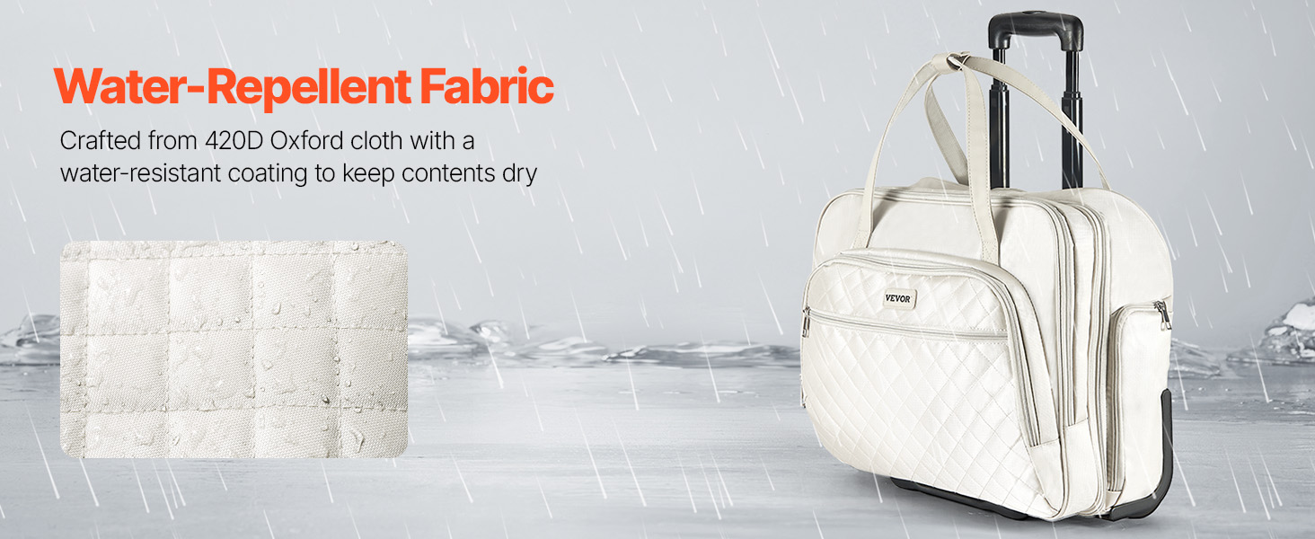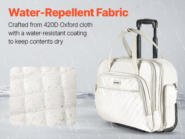 This rolling laptop bag fits 15.6 in laptops and features a 4-height telescopic handle for easy travel. With multiple compartments and a quick-access pocket, it keeps essentials organized. Made of durable 420D Oxford fabric with a waterproof coating, it shields your belongings from light rain.