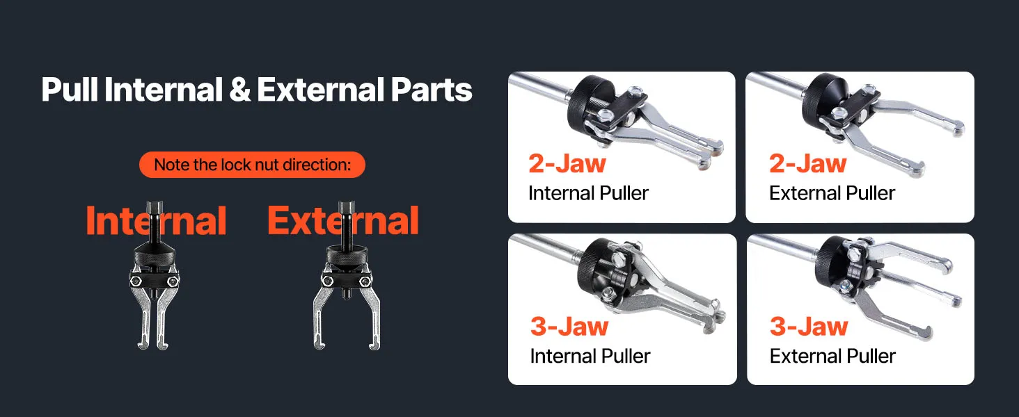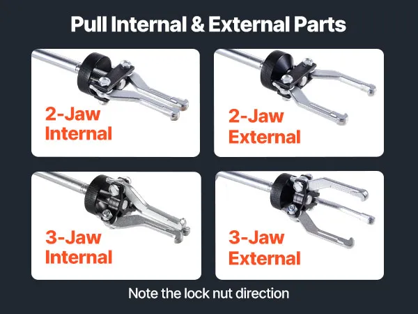 • Internal and External Claw Pulling: This slide hammer set includes internal and external pullers with both 2-jaw and 3-jaw adapters. It provides four different setups for tackling bearings, seals, and gears from any angle