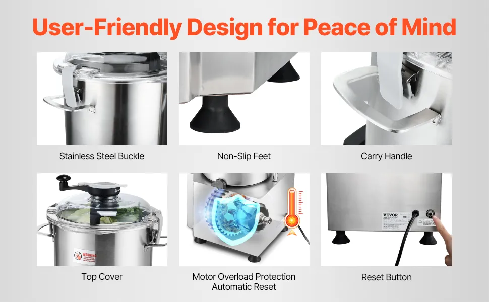 The food processor can be used in restaurants, dessert shops, home kitchens, hotels, and more. It allows you to easily chop a variety of vegetables and fruits.