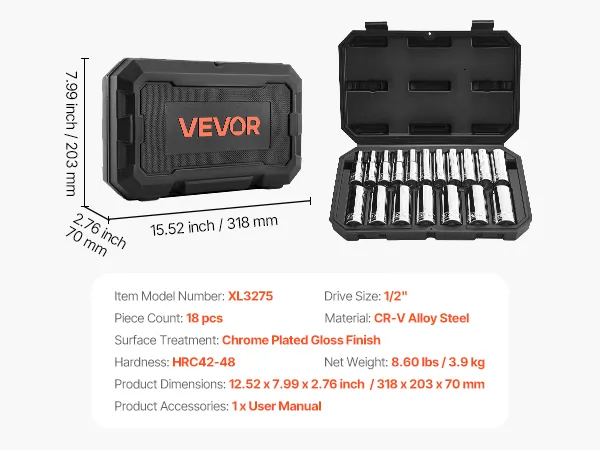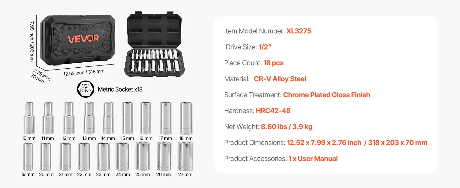 VEVOR Socket Set, 18 Pieces, 12.7 mm Drive Socket Tool Set, Metric Size from 10 to 27 mm, Mechanic Tool Kit with Storage Case, Clear Markings, Chrome Plated CR-V Alloy Steel, for Automotive Repair