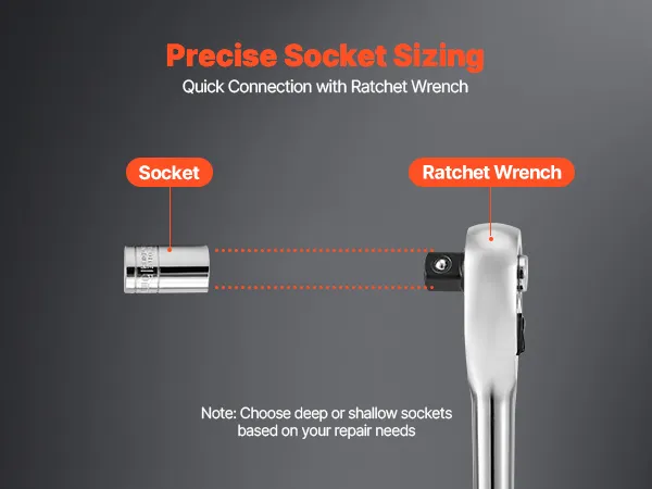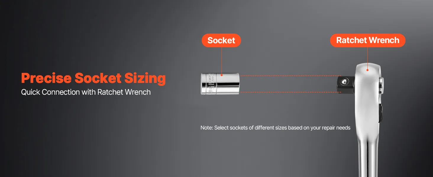 Accurately sized sockets ensure an ideal fit with the ratchet wrench. Effortlessly swap between different sizes to boost efficiency and adaptability for a wide range of applications.
