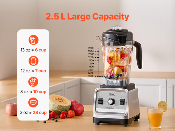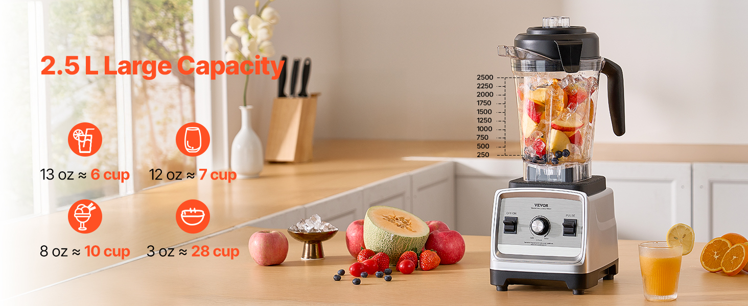 2.5 L / 85 oz blender has 1600W high-speed motor. This powerful blender machine quickly crushes ice into smooth, fine slush, ideal for making cold beverages like smoothies and slushies. Easy to use, secure, and reliable.
