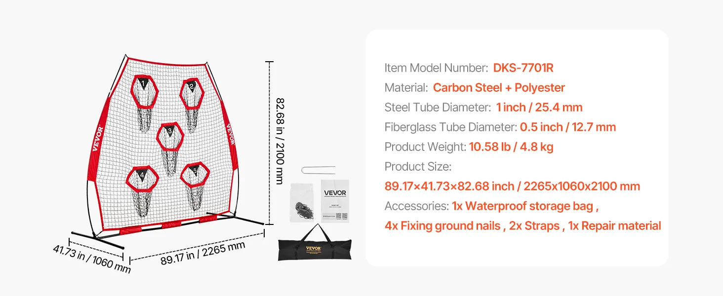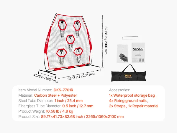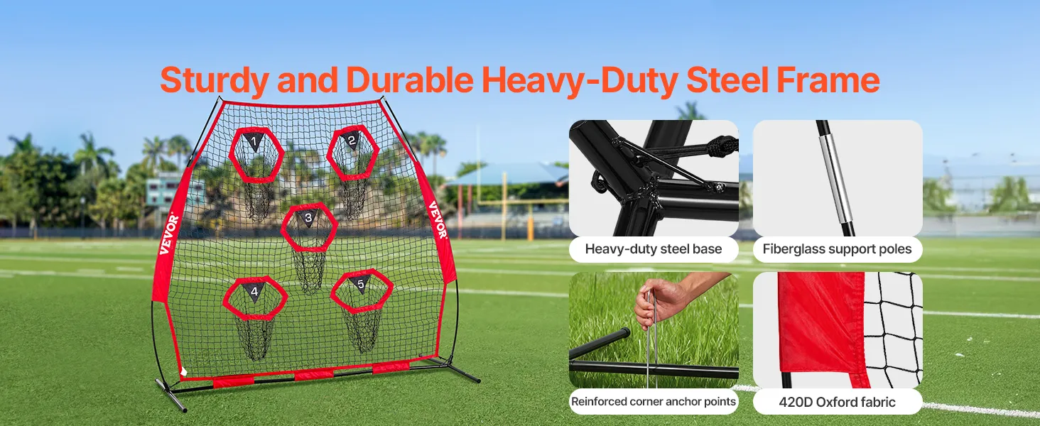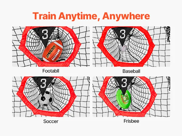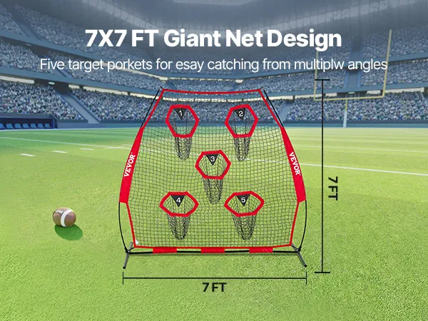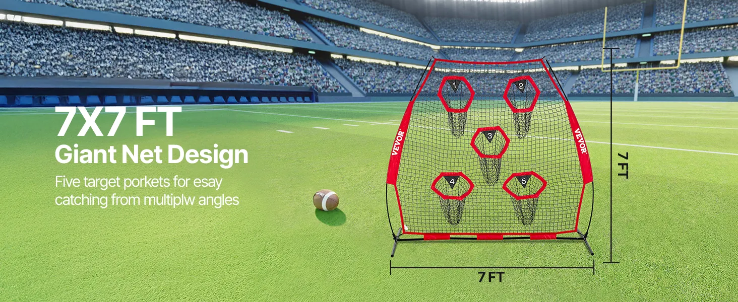 The football training target net comes equipped with a 7x7-foot large net and 5 target pockets, ensuring you can throw the ball from various directions and distances.
