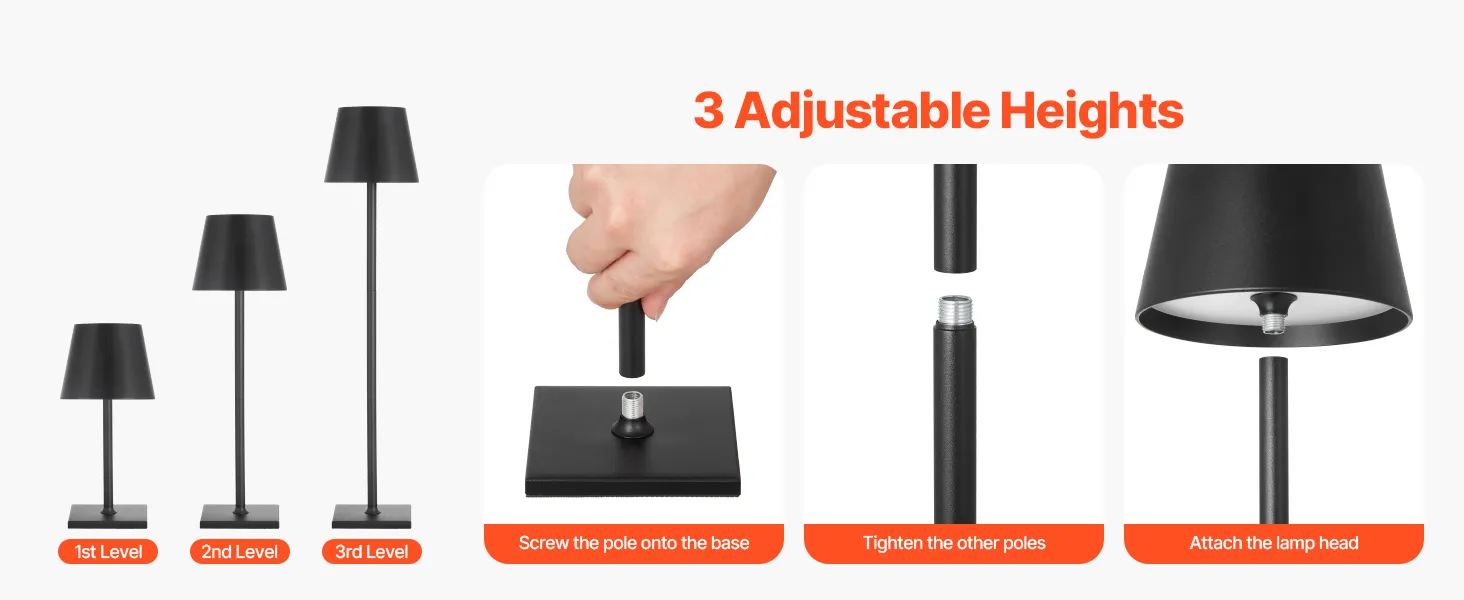 VEVOR Cordless Table Lamp, 2-Pack, 5200mAh Built-in Rechargeable Battery Desk Lamp, Stepless Dimming Up, 3 Adjustable Heights, Detachable Lampshade for Bottle, Restaurant, Bedroom, Outdoor, Black