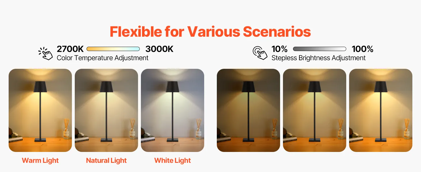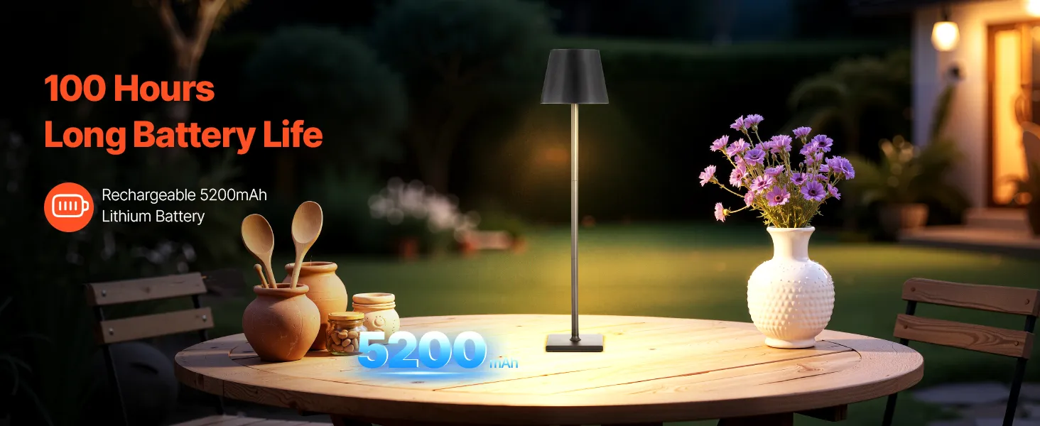 This cordless table lamp is built for ultimate convenience and comfort. It delivers long-lasting performance for reading, working, or outdoor activities, providing consistent light. The stepless dimming feature easily adjusts between soft ambiance and bright reading light with just one touch.