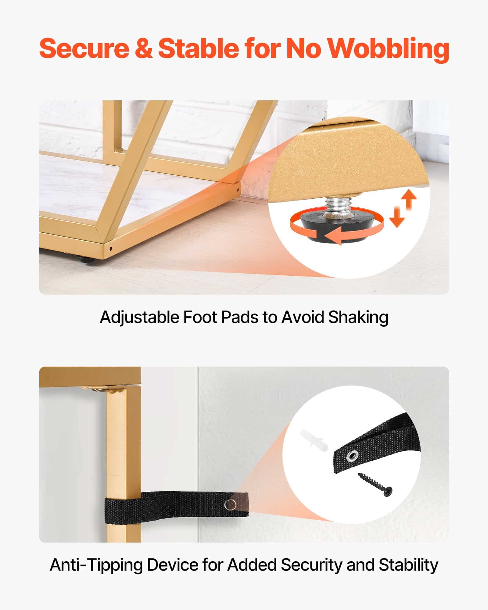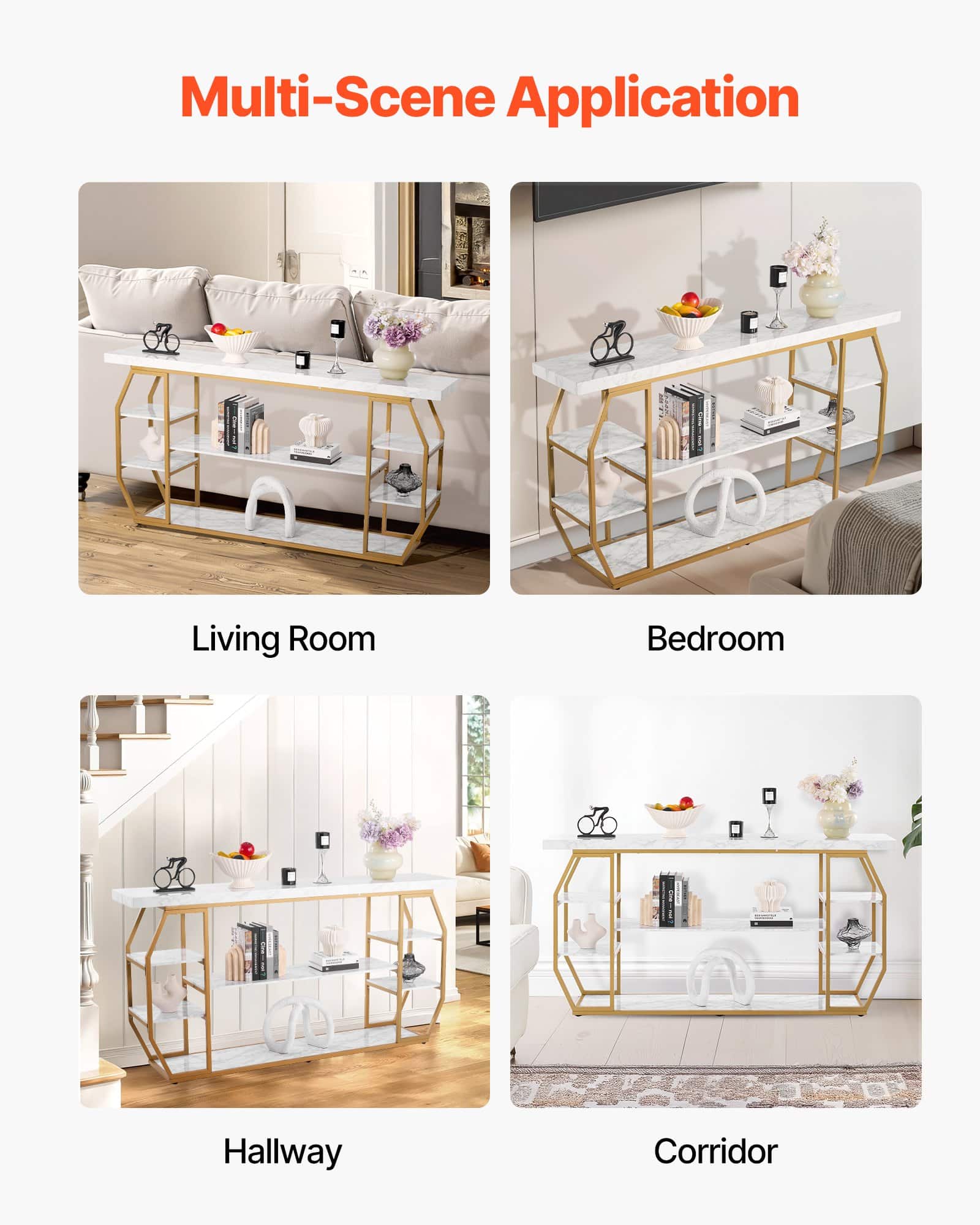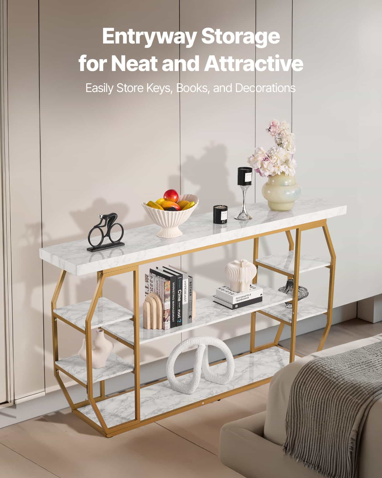 VEVOR Marble Console Table, 3 Tiers Modern Console Table for Open Storage, Golden Geometric Table with Iron Tubes, Anti-Tip Device and Triangular Support for Living Room, Hallway, Entryway, Foyer