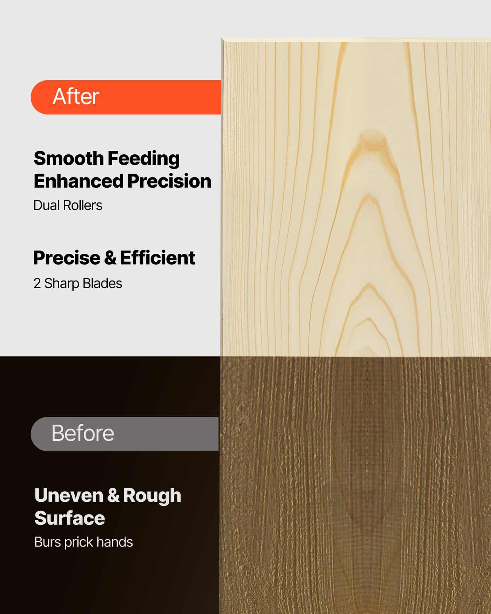A: The planer features dual rollers at infeed/outfeed ports for stable feeding. It ensures the worktable is level during use, or add sacrificial scrap boards before/after your project boards.