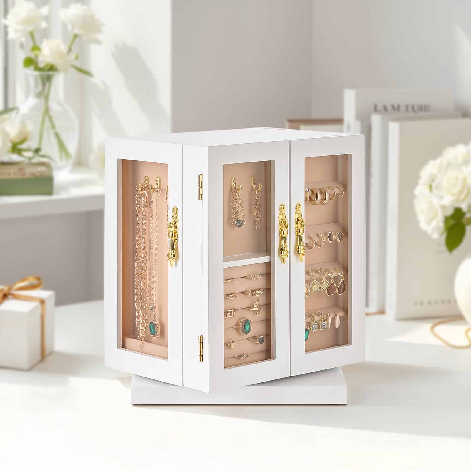 This jewelry box organizer rotates 360°, providing a full view for easy display and quick access, allowing you to find and organize your jewelry without the hassle.