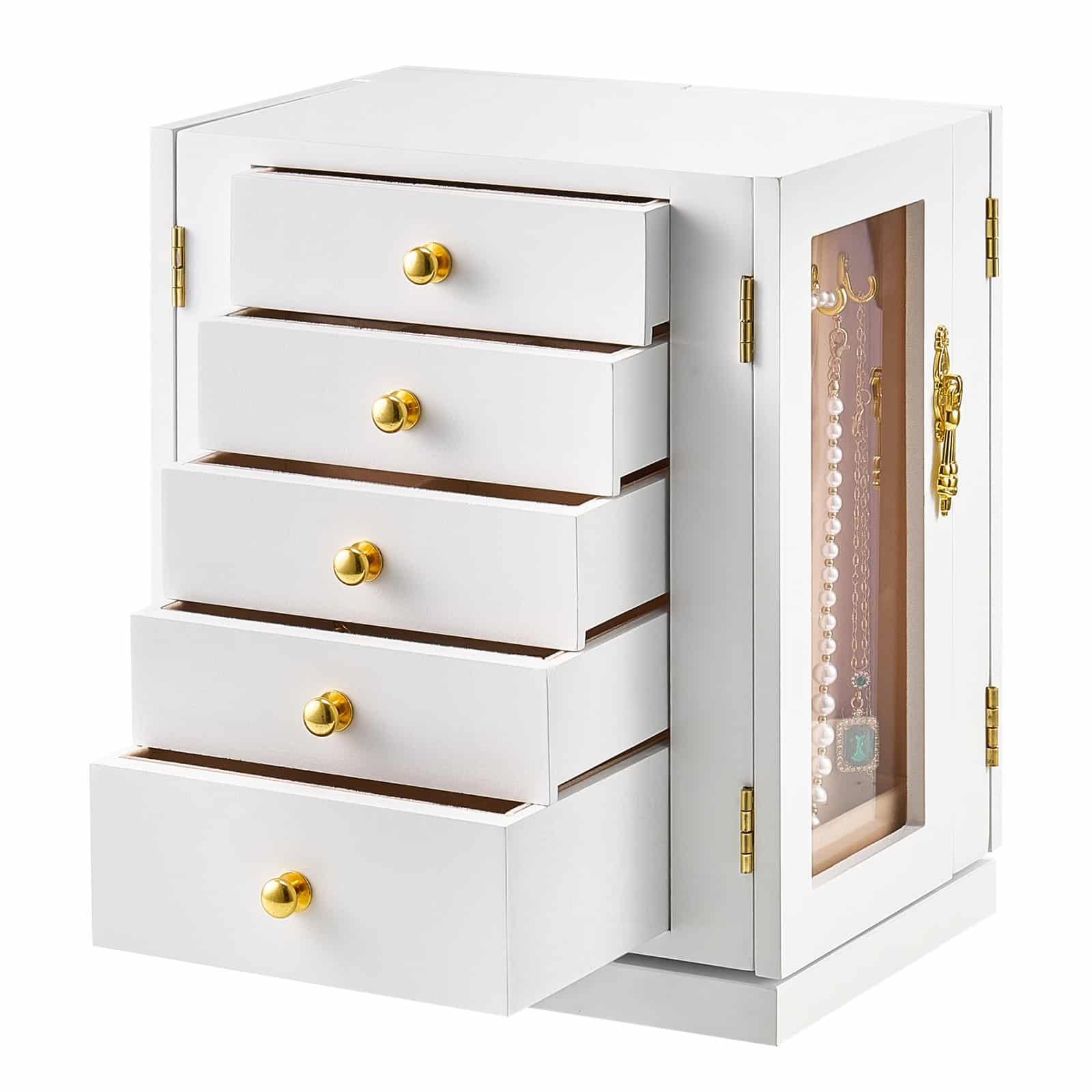 VEVOR Jewelry Box, 360° Rotating Jewelry Organizer with 5 Drawers, Acrylic Window, 4 Necklace Hooks on Each Side, Spacious Storage Case with Metal Handles, Bottom Pad and Soft Velvet Lining, White