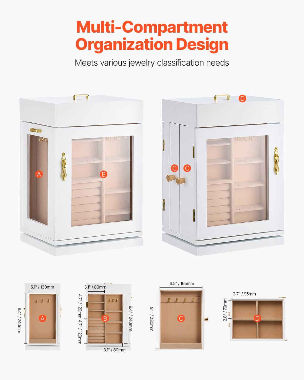 This jewelry box organizer rotates 360°, providing a full view for easy display and quick access, allowing you to find and organize your jewelry without the hassle.