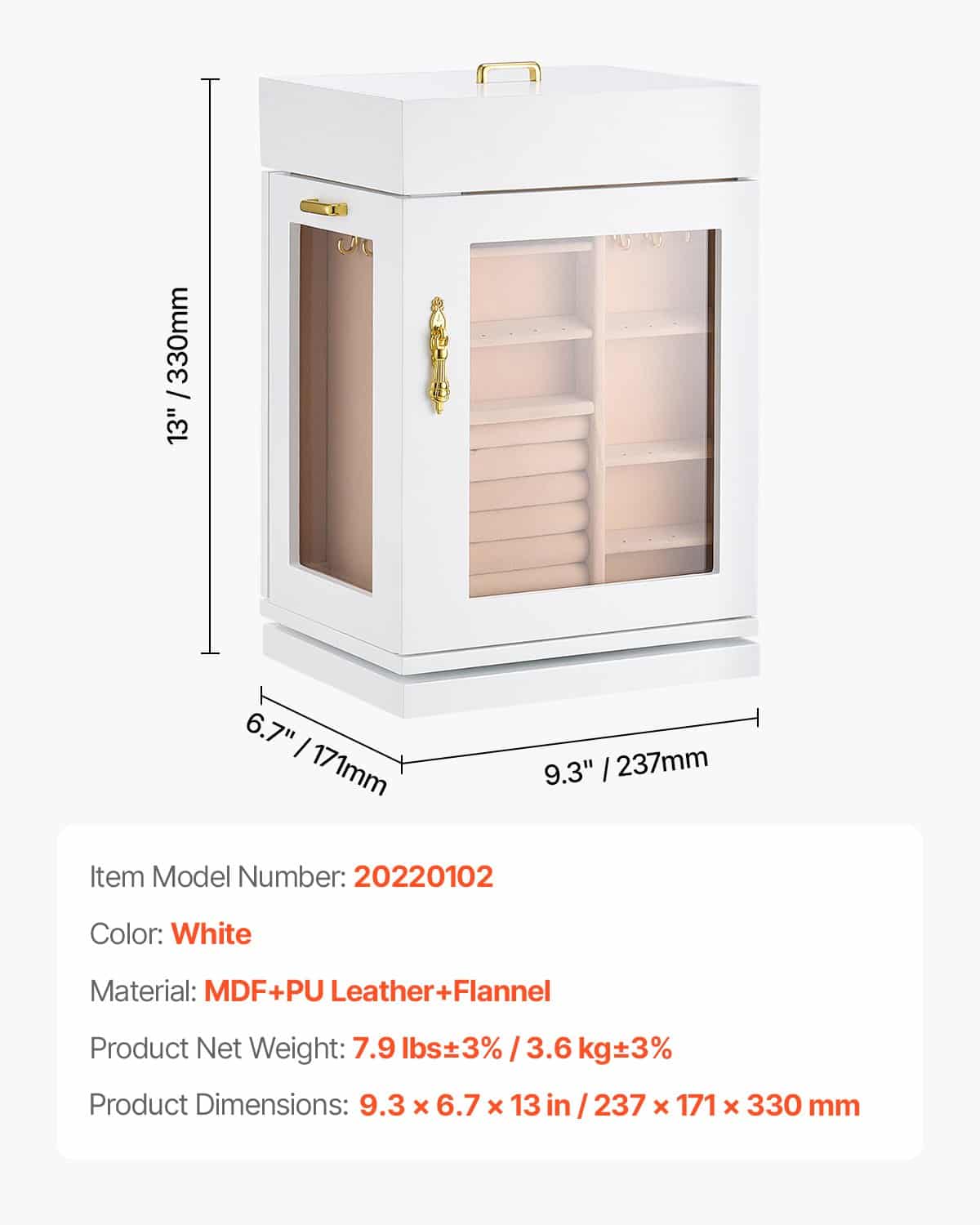 VEVOR Jewelry Box, 360° Rotating Jewelry Organizer with Magnetic Door, Acrylic Window and Built-in 4 Necklace Hooks, Spacious Storage Case with Metal Handles, Bottom Pad and Soft Flannel Lining, White