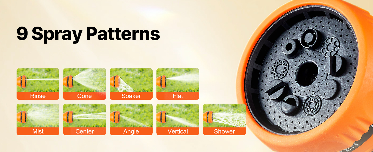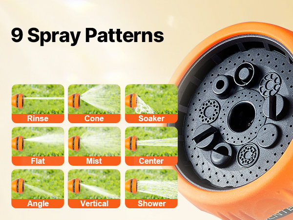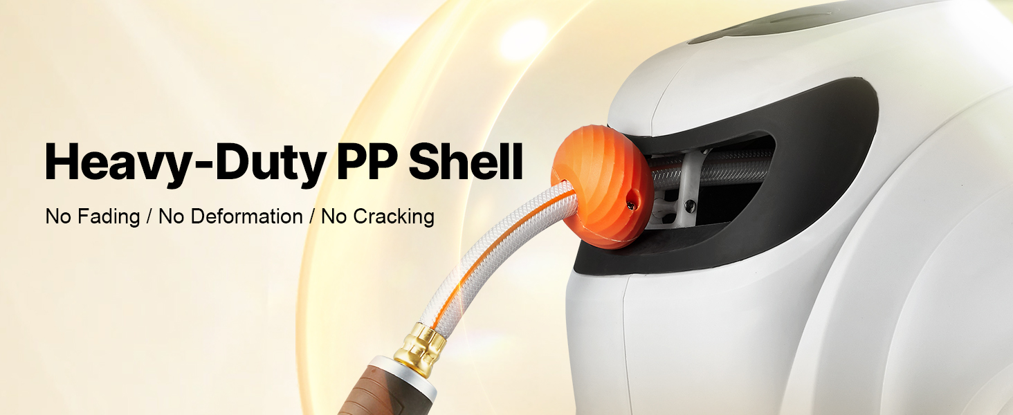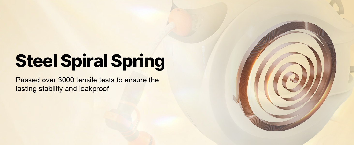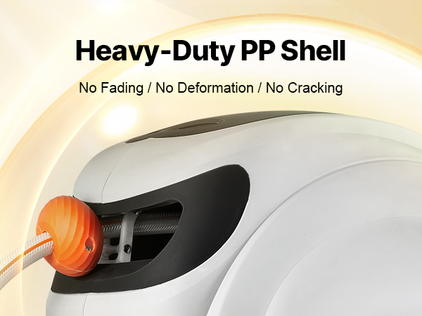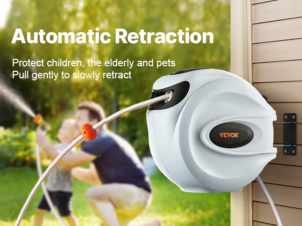 This retractable hose reel features durable, leak-proof metal connectors, a slow rewind system, and 9 spray settings. Its sun and freeze-resistant design suits all weather, with an adjustable lock and handle for easy storage and mobility. The higher water flow boosts efficiency.