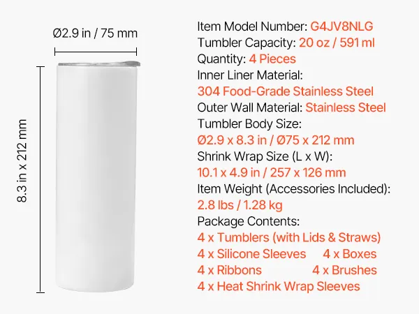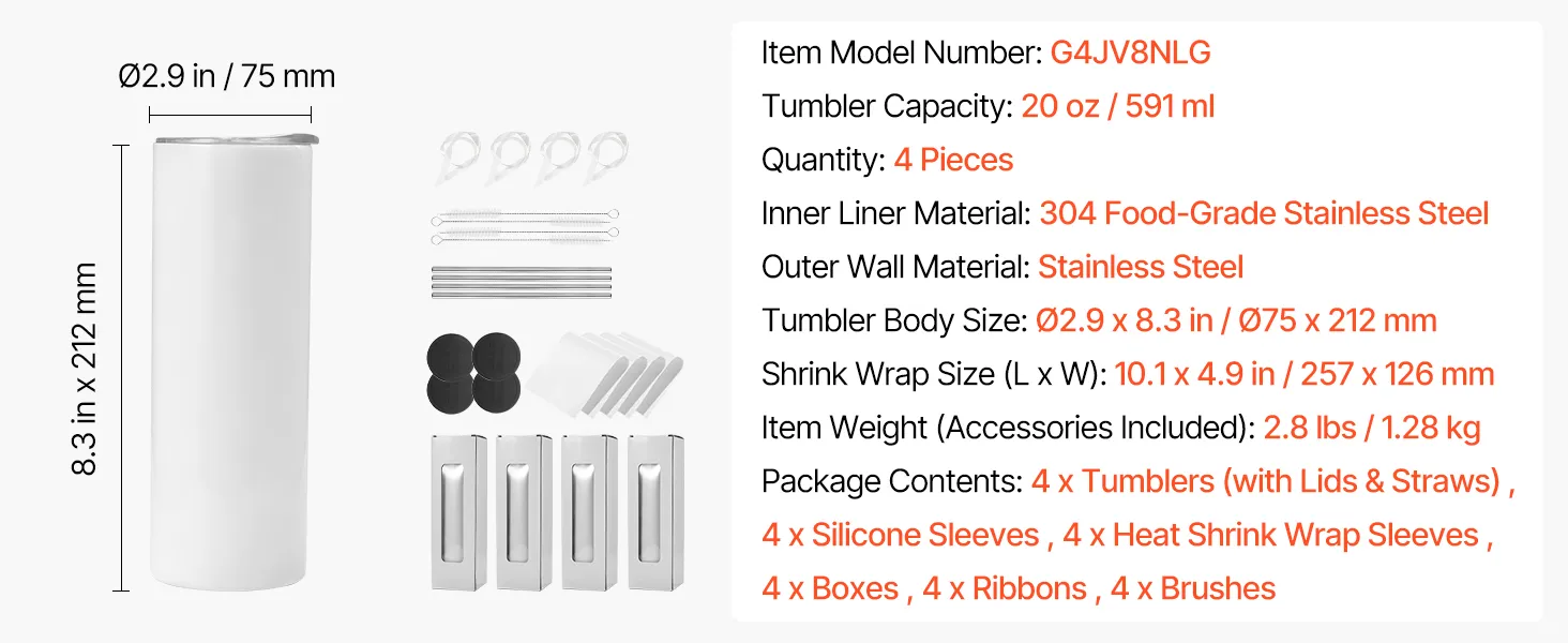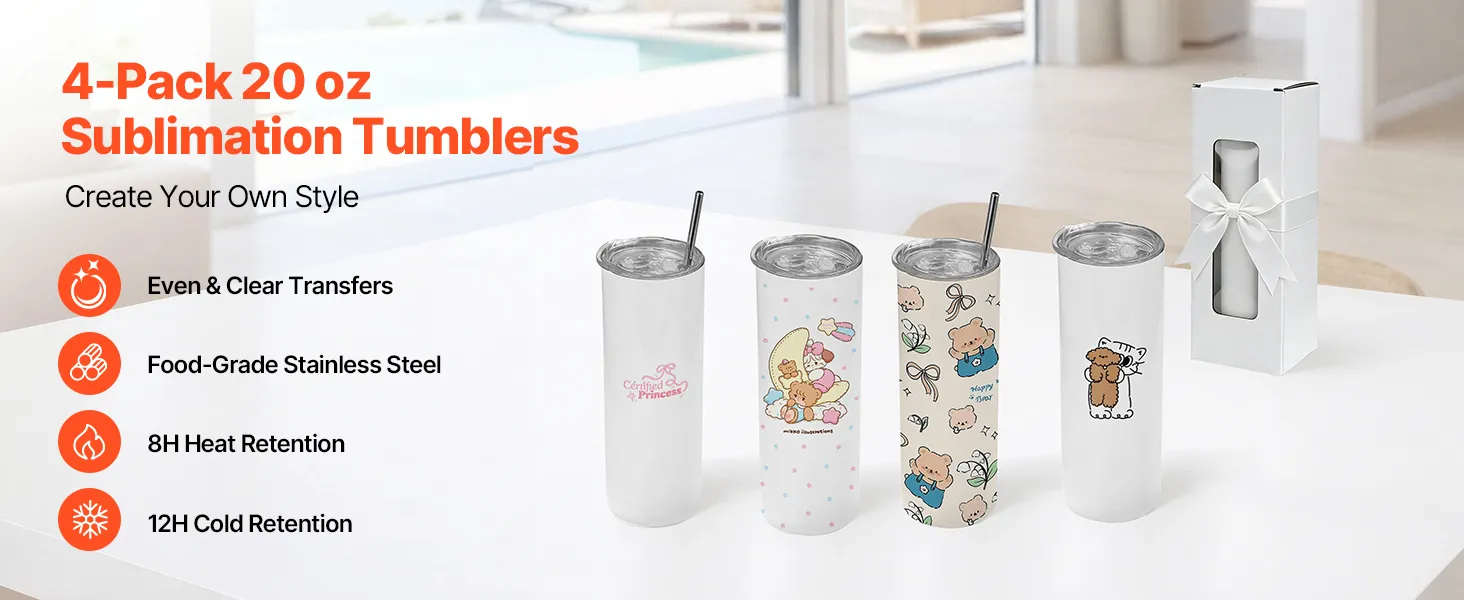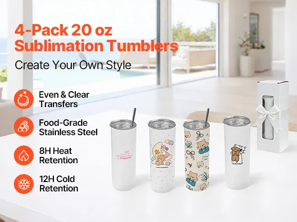 VEVOR Sublimation Tumblers, 4 Pack, 591 mL Skinny Straight Tumblers Bulk, Stainless Steel Sublimation Cups with Lids and Straws, Double Wall Insulated Tumbler Blank, for DIY Personalized Customization