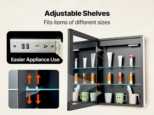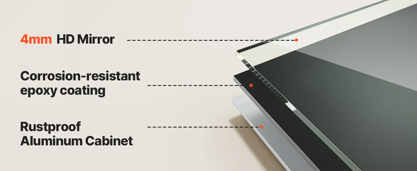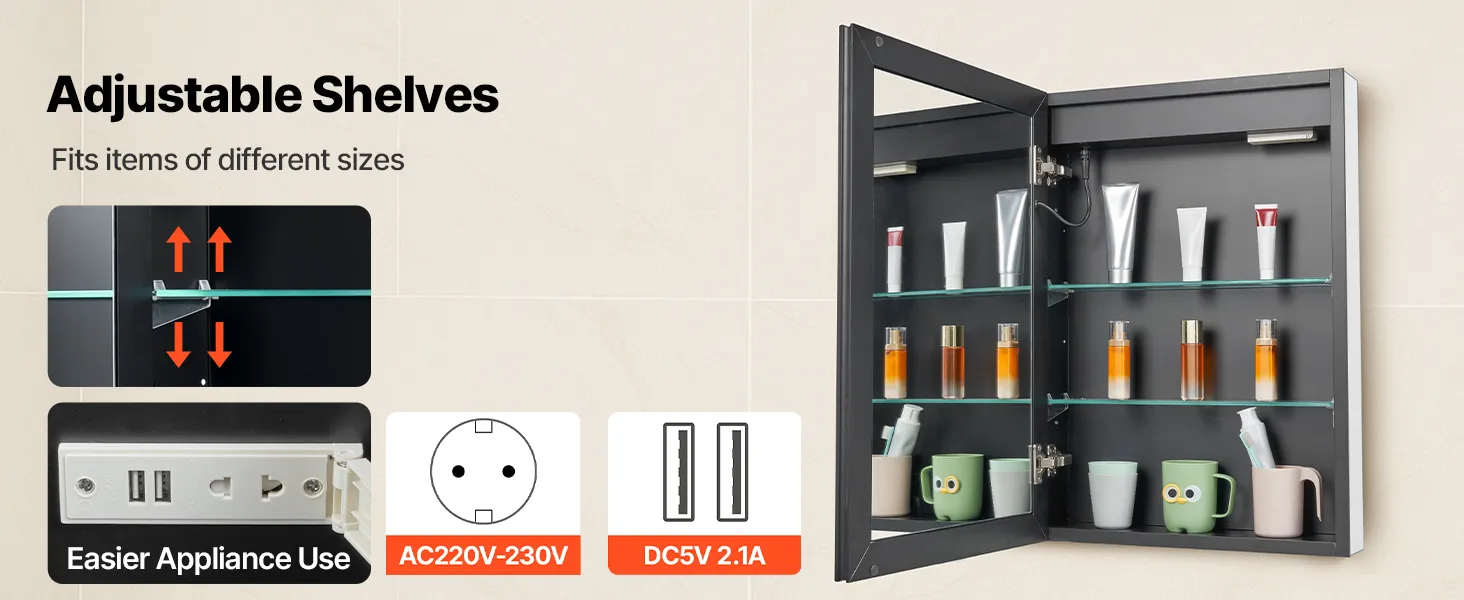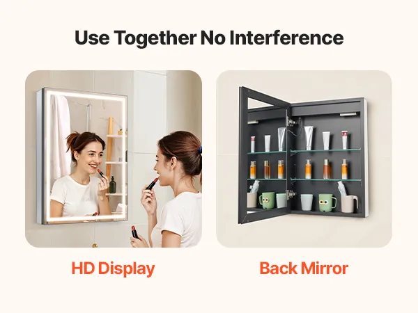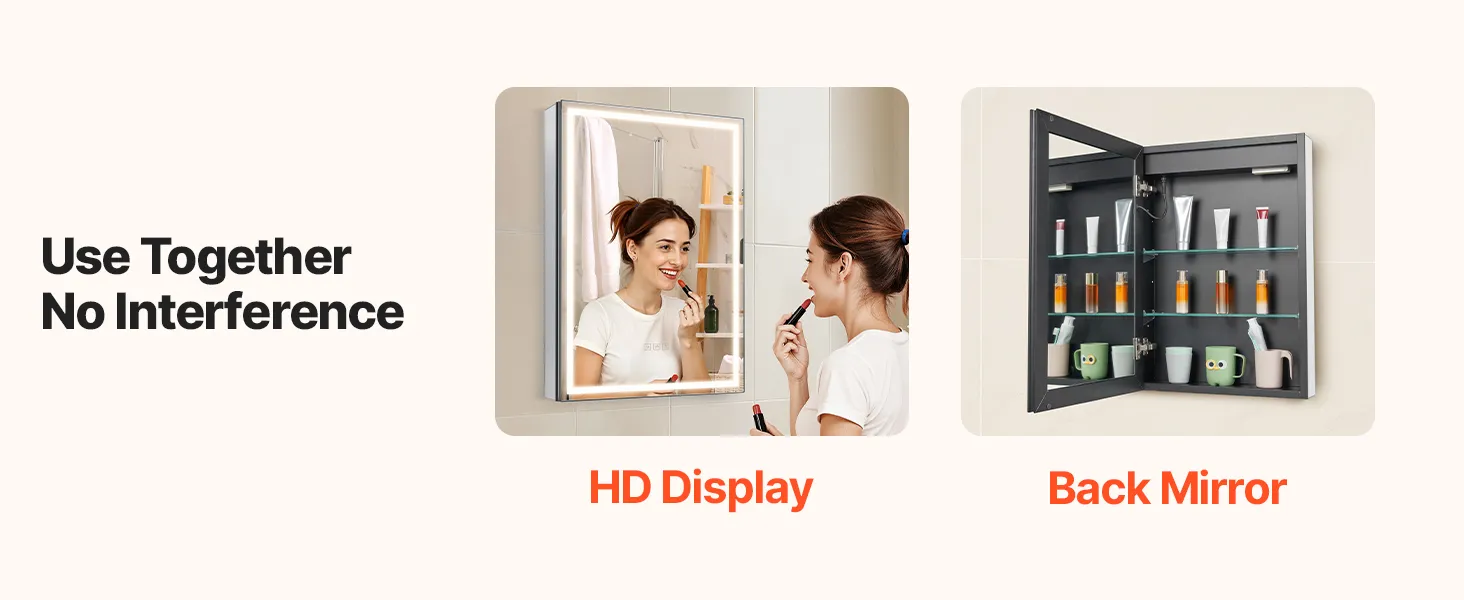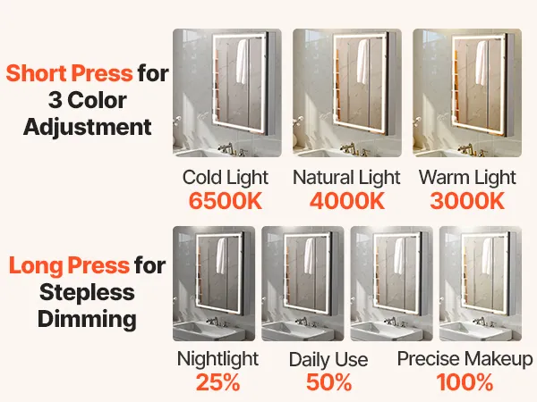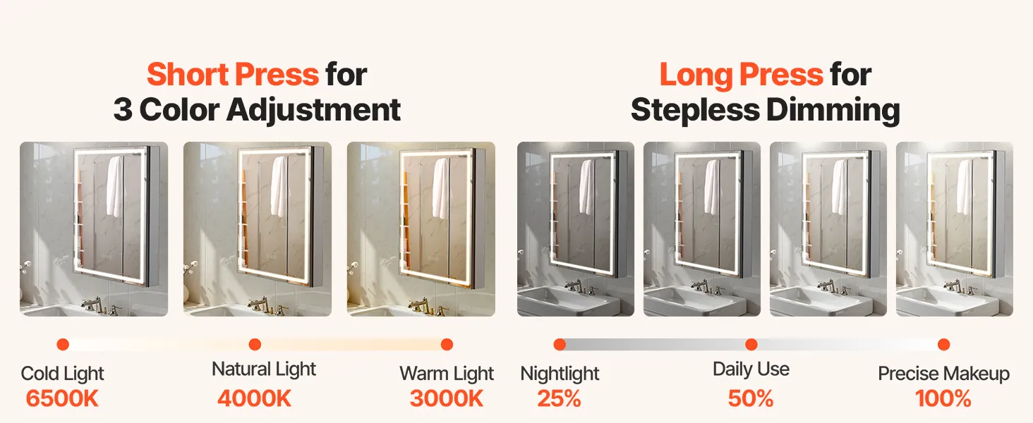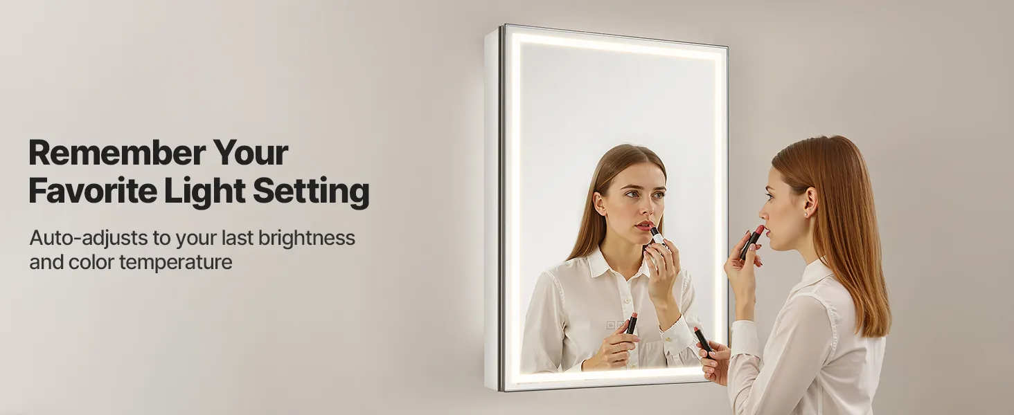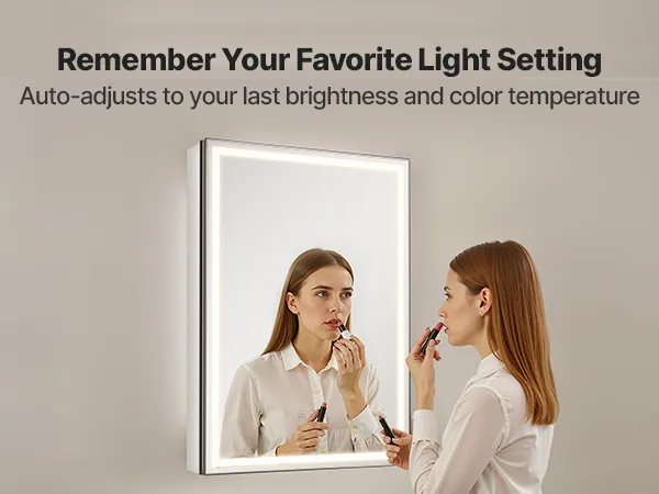 This LED mirror cabinet offers high-brightness light for makeup and low-brightness warm light for a gentle wash at night. The memory function automatically recalls the last brightness setting. It meets your lighting needs at different times of the day