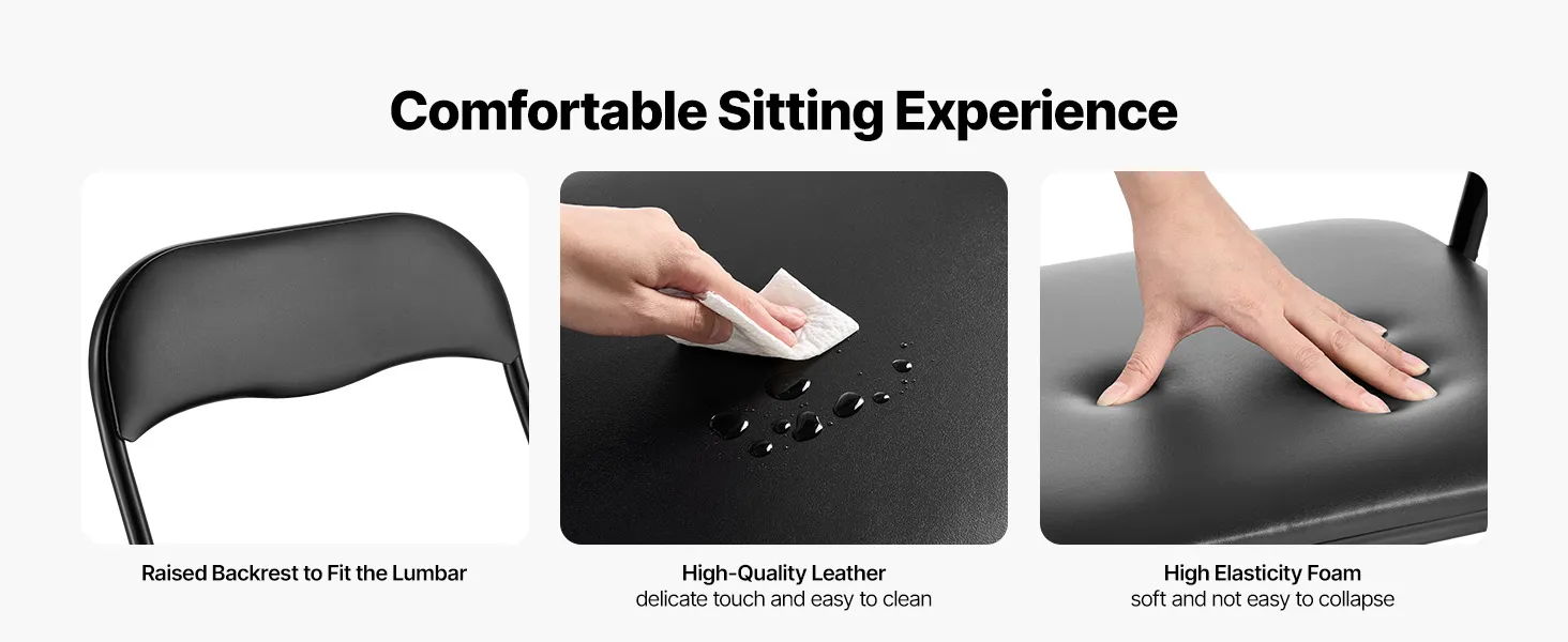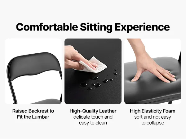 • Exceptional Comfort: This folding chair is engineered for superior seating comfort. The backrest and seat are padded with high-density foam and wrapped in premium leather, offering a soft touch that retains its shape even after prolonged use. The ergonomically angled high backrest provides robust support for the waist and hips, reducing fatigue and ensuring comfort during extended sitting