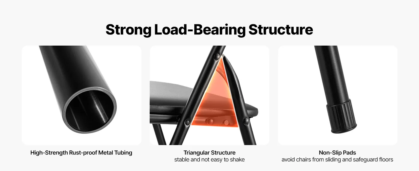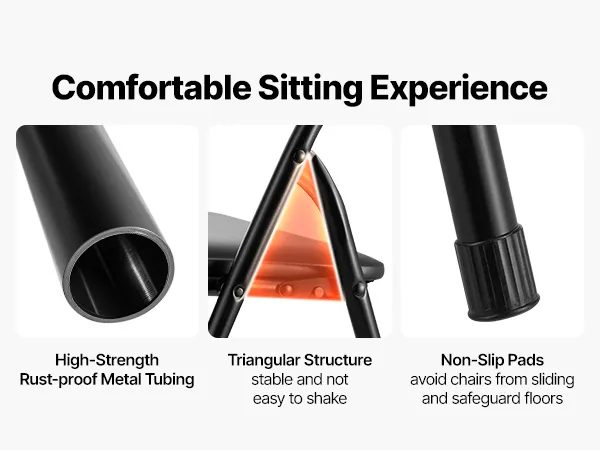• Premium Materials: Our folding chairs feature a high-quality metal frame with anti-rust treatment, ensuring long-lasting durability and resistance to oxidation. The backrest and seat cushion are made of PVC leather, which is wear-resistant, waterproof, and easy to clean. With a stable triangular structure, it can support up to 350 lbs / 158 kg, while the non-slip foot caps enhance stability