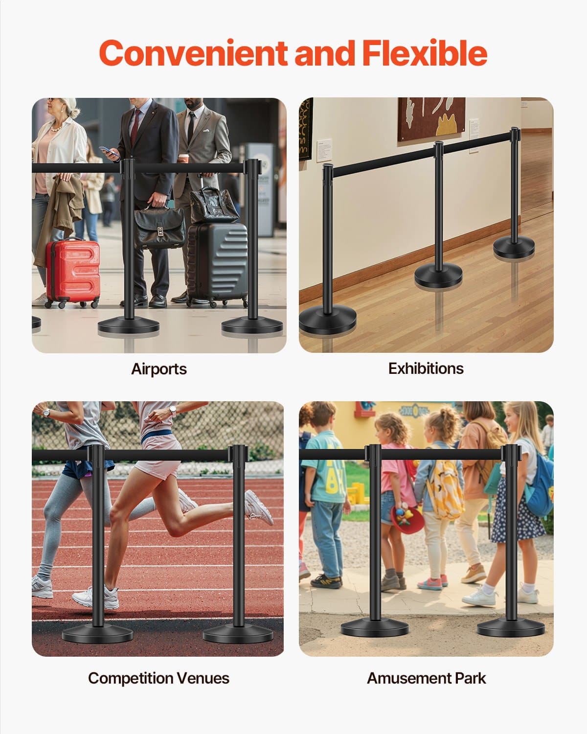 VEVOR Stanchion Post, 6 Pcs Crowd Control Barrier with 6 Retractable Belts, Carbon Steel Black Stanchion Post Queue with Sand Injection Hollow Base for Theaters, Parties, Weddings, Exhibitions, Black