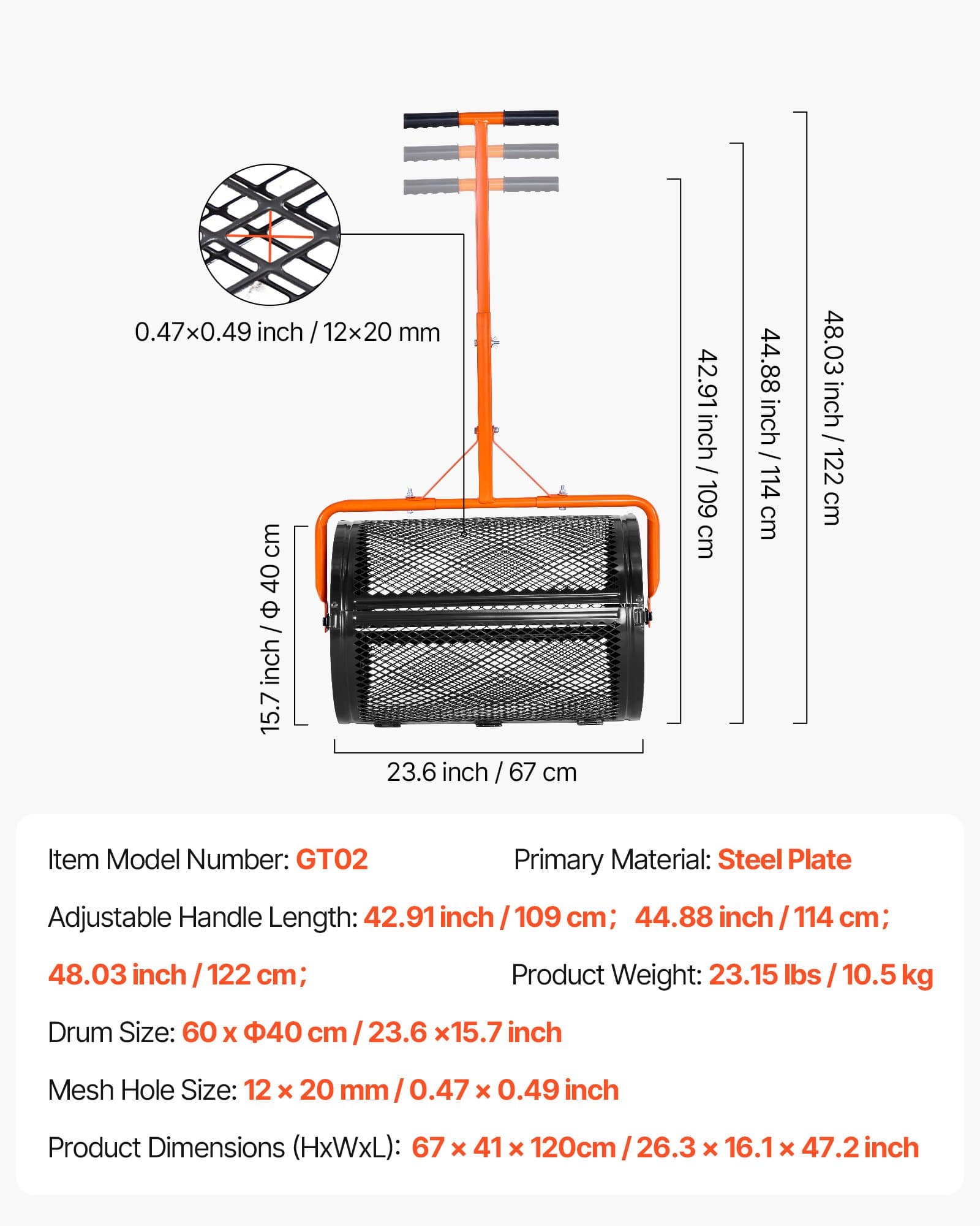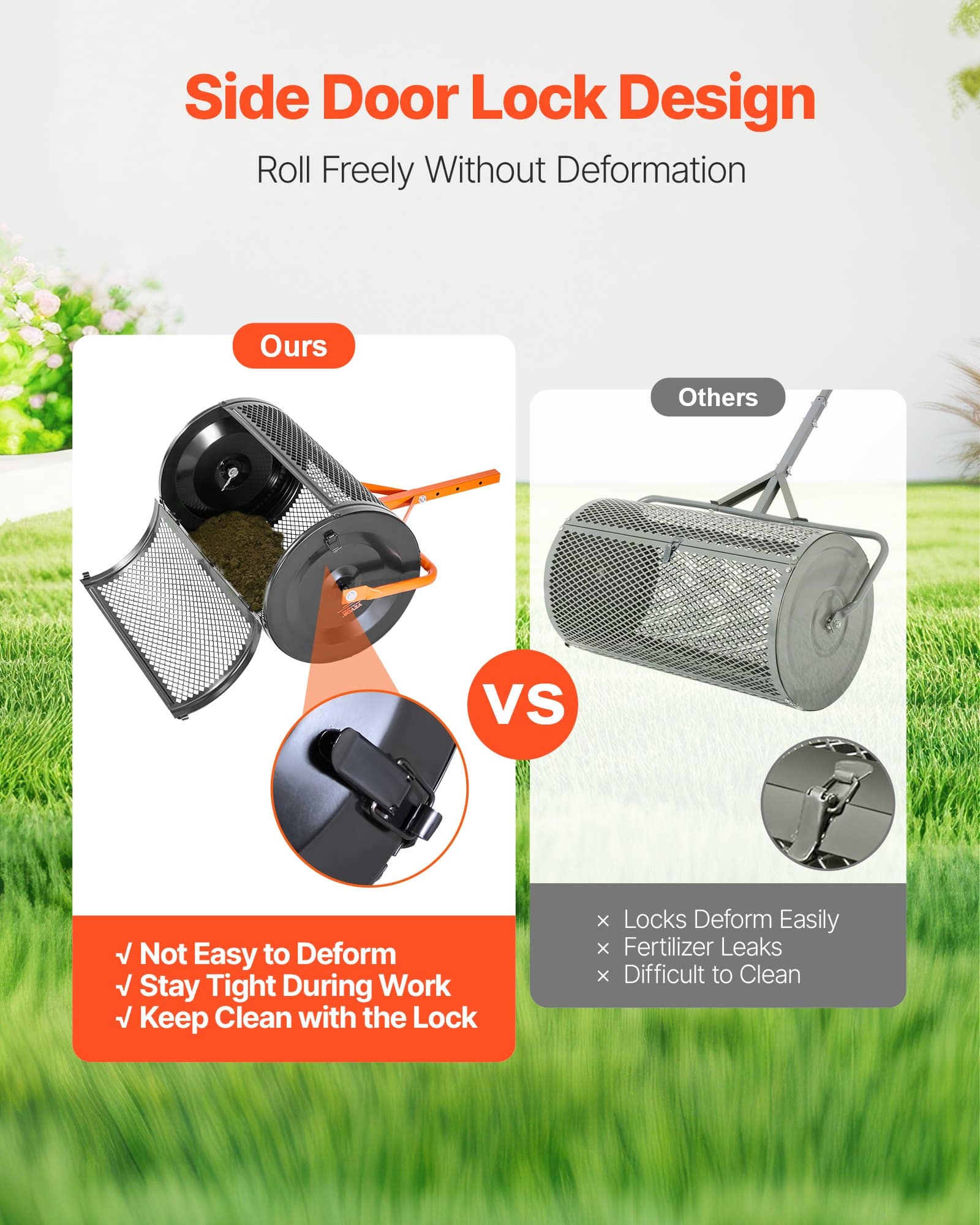 VEVOR Compost Spreader, 24 in Wide Peat Moss Spreader with T Shaped Handle, 3 Heights Adjustable, Powder-Coated Steel Garden Peat Moss Roller, Heavy Duty Grass Seed Spreaders for Planting Seeding