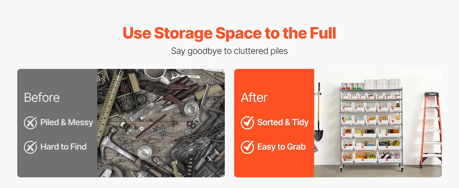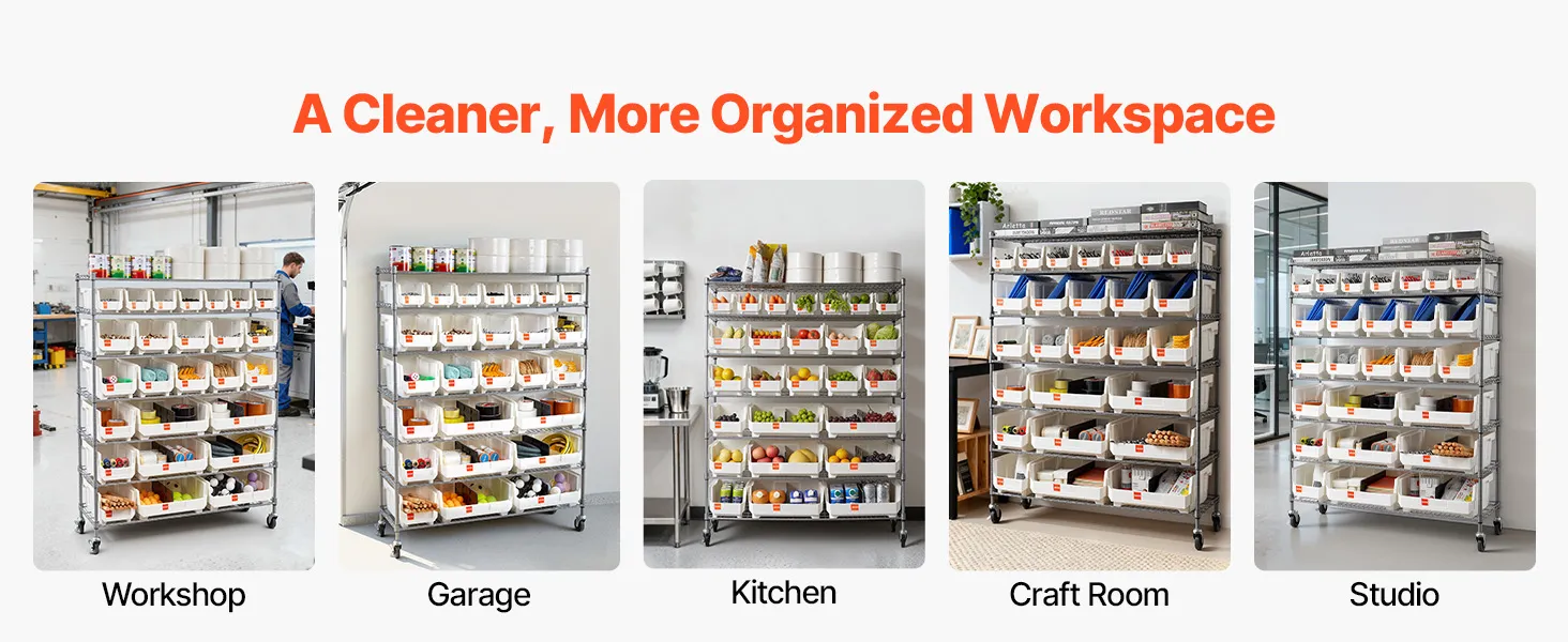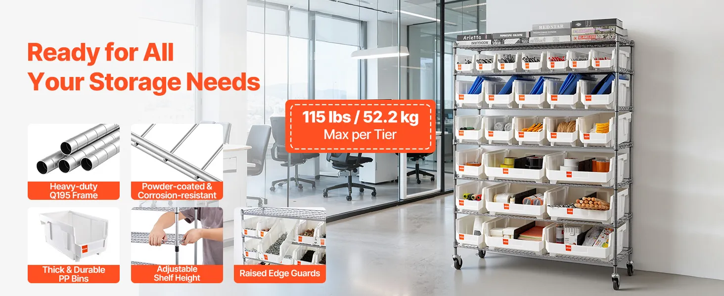 Each bin organizer shelf supports up to 115 lb (52.2 kg) for confident daily use. The powder-coated Q195 frame resists wear, while rugged PP bins and raised rails help keep items right where you want them.