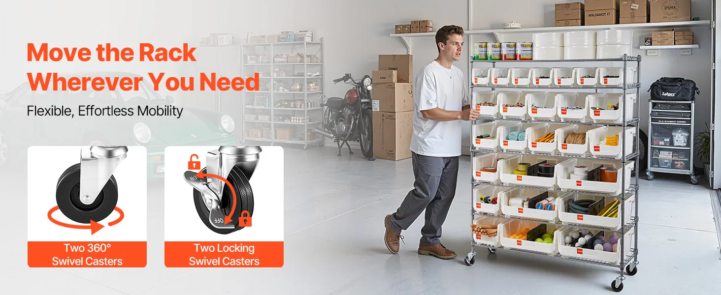 This rolling bin rack brings multi-tier flexibility and adjustable shelves for changing needs. The sturdy Q195 steel frame and smooth 360° casters help you zip gear anywhere with a smile.