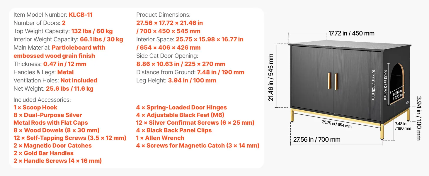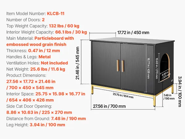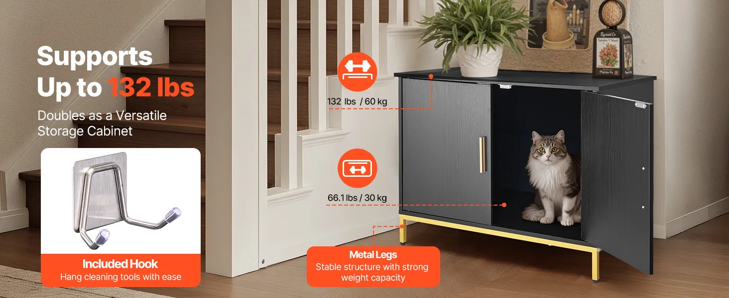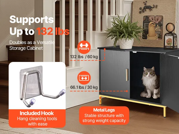 The top platform of our litter box enclosure furniture supports up to 132 lbs, which can easily hold books, decorations, and other items. The metal legs at the bottom provide stability, resisting shaking even when large cats jump.