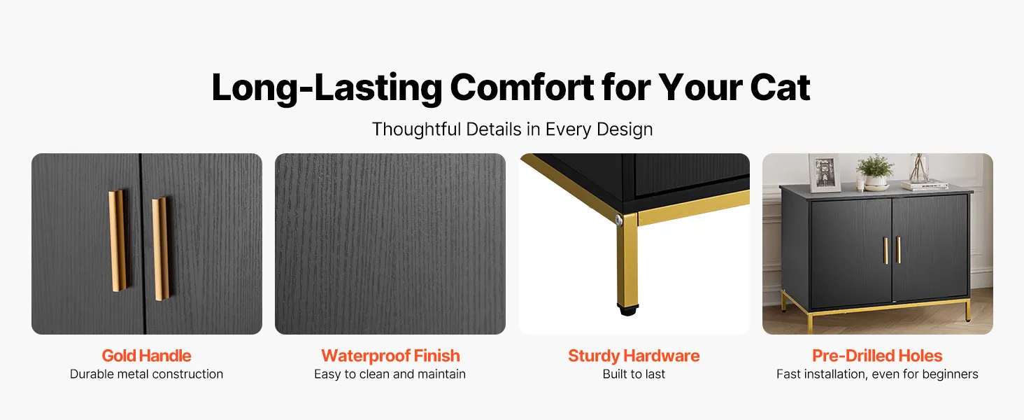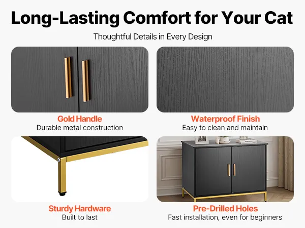 This wooden litter box enclosure is equipped with a sturdy and durable metal handle and an easy-to-clean waterproof finish. It comes with complete durable hardware accessories and a pre-drilled design, which allows even beginners to install it easily.