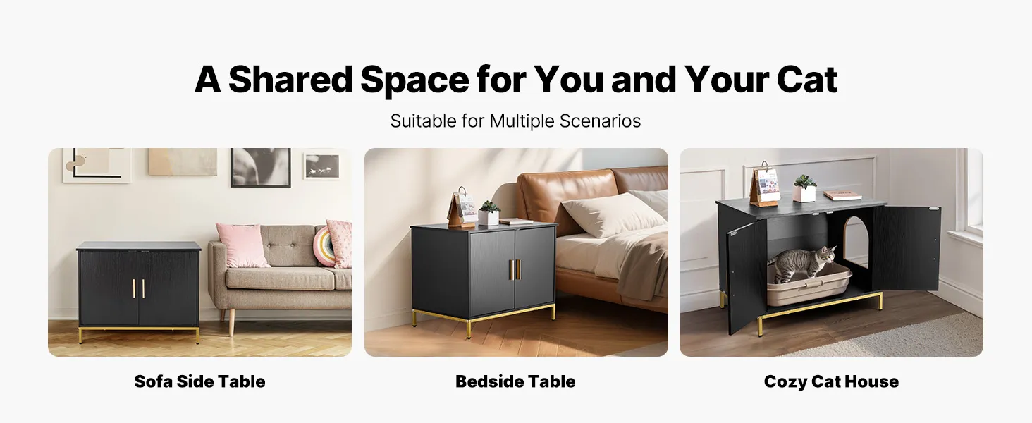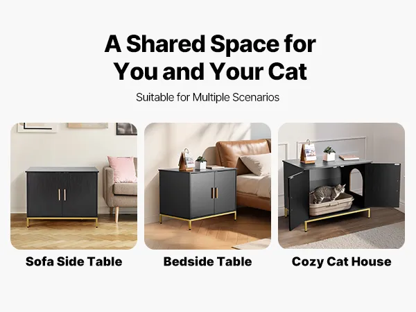 Our cat litter furniture hidden serves as a litter cabinet, a bedside table, a sofa side cabinet, and a cat house, all in one. It easily blends into various home styles, such as living rooms and bedrooms.