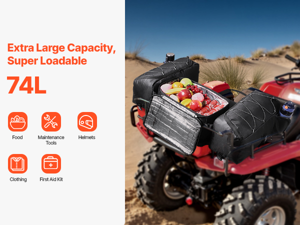 VEVOR ATV Rear Storage Bag, 74L ATV Rear Cargo Bag with Cooler Insulated Bag, 600D Oxford Cloth Storage Rear Rack Seat Bag Fit Most ATVs with Rear Rack, Compatible with ATV, UTV, Can-Am Vehicles