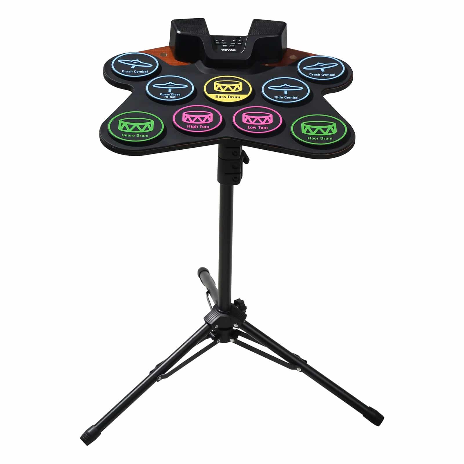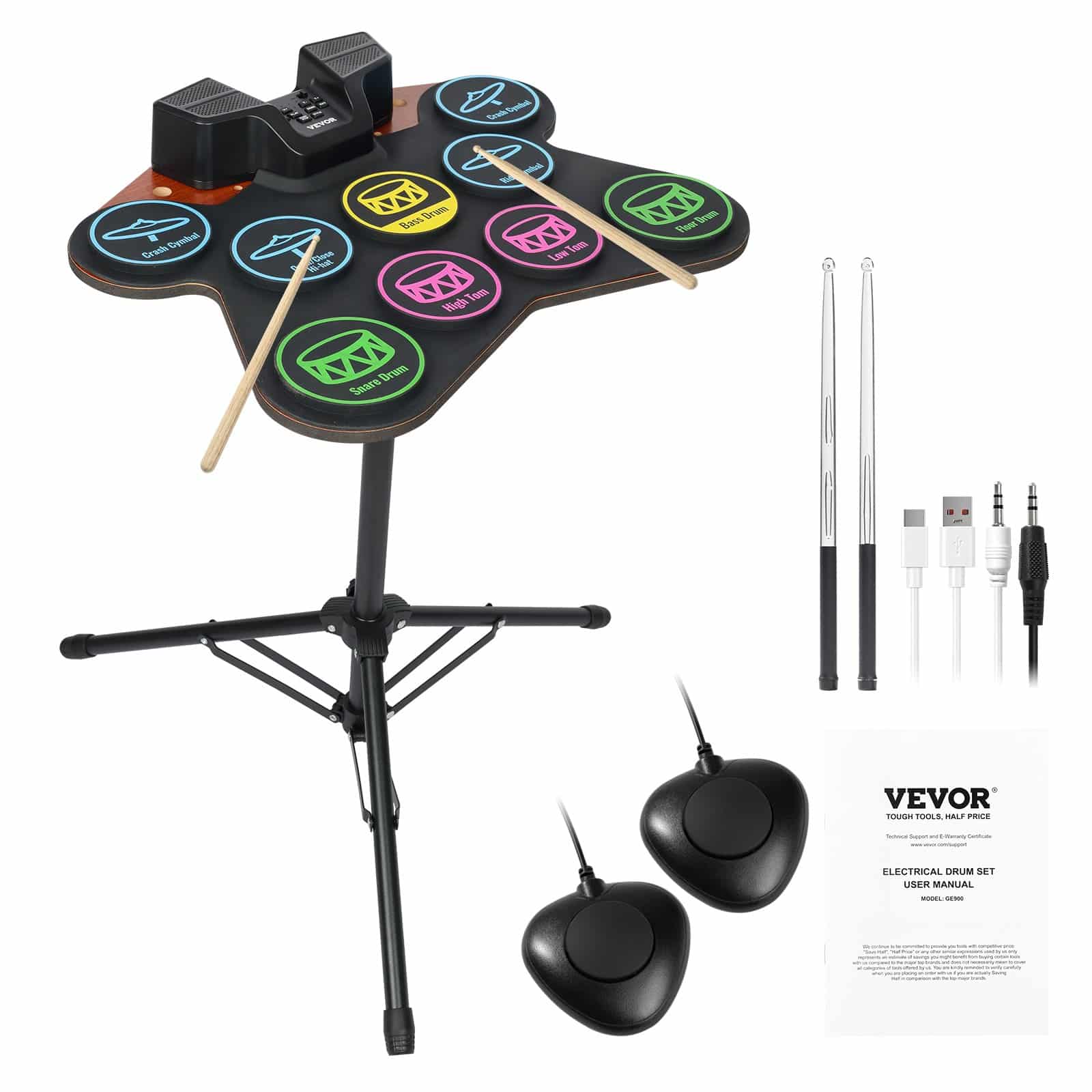 VEVOR Electric Drum Set, 9 Pads, Roll-up Drum Practice Pad, Electronic Drumset with Headphone Jack, Stand, Double Pedals, Light Up Drum Sticks, Built-in Dual Speakers, Instrument Toy for Kids Ages 5+