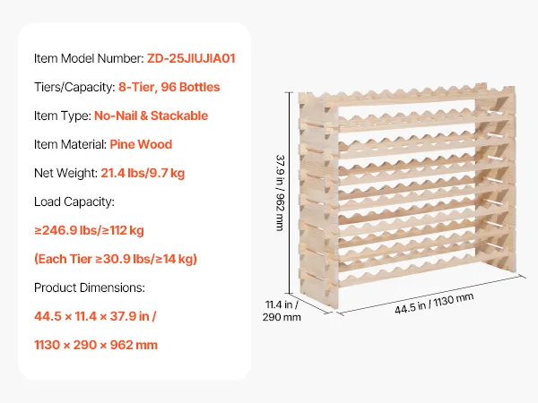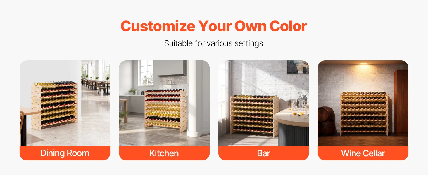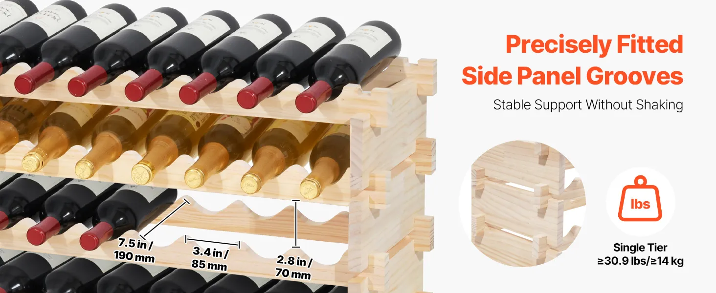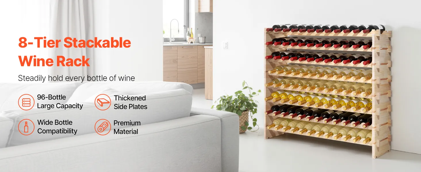 This freestanding pine stackable modular wine rack features an 8-tier stackable design that easily stores up to 96 bottles. Its thick side panels and racks design keep steady with no wobble, fitting Bordeaux, Pinot Noir, Champagne, and other bottle shapes.