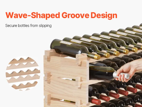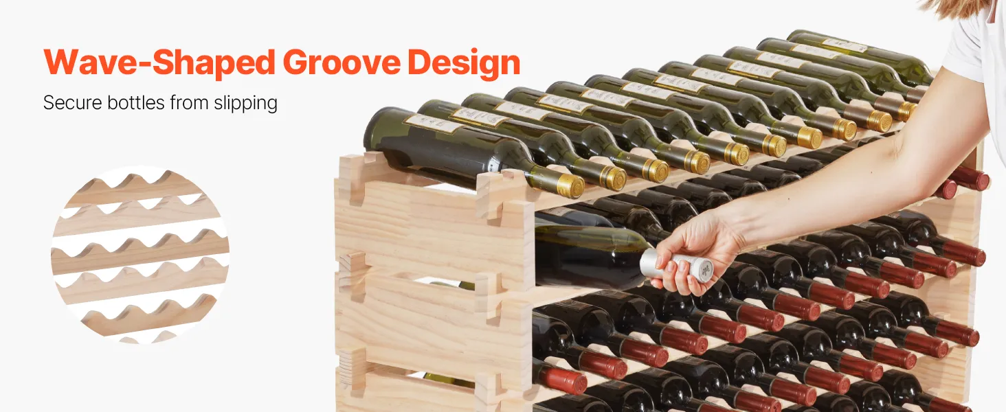 Featuring a unique deepened wave-shaped grooves, our wine rack free standing floor holds bottles securely and avoids slipping. The slight front-and-back tilt keeps corks wet and blocks air entry that may cause wine oxidation, helping the wine stay fresh for a longer time.