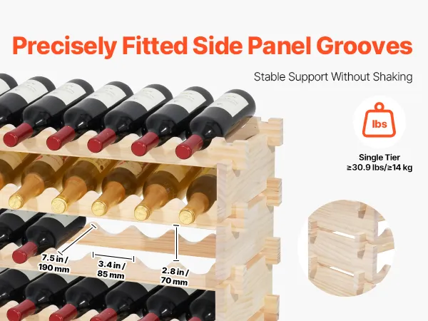 Built with 0.8 in/20 mm thick side panels for support, the rack notches slot precisely into the side-panel grooves. Supporting up to 176.4 lbs/80 kg, this wine rack freestanding floor stays stable without wobbling even when fully loaded.