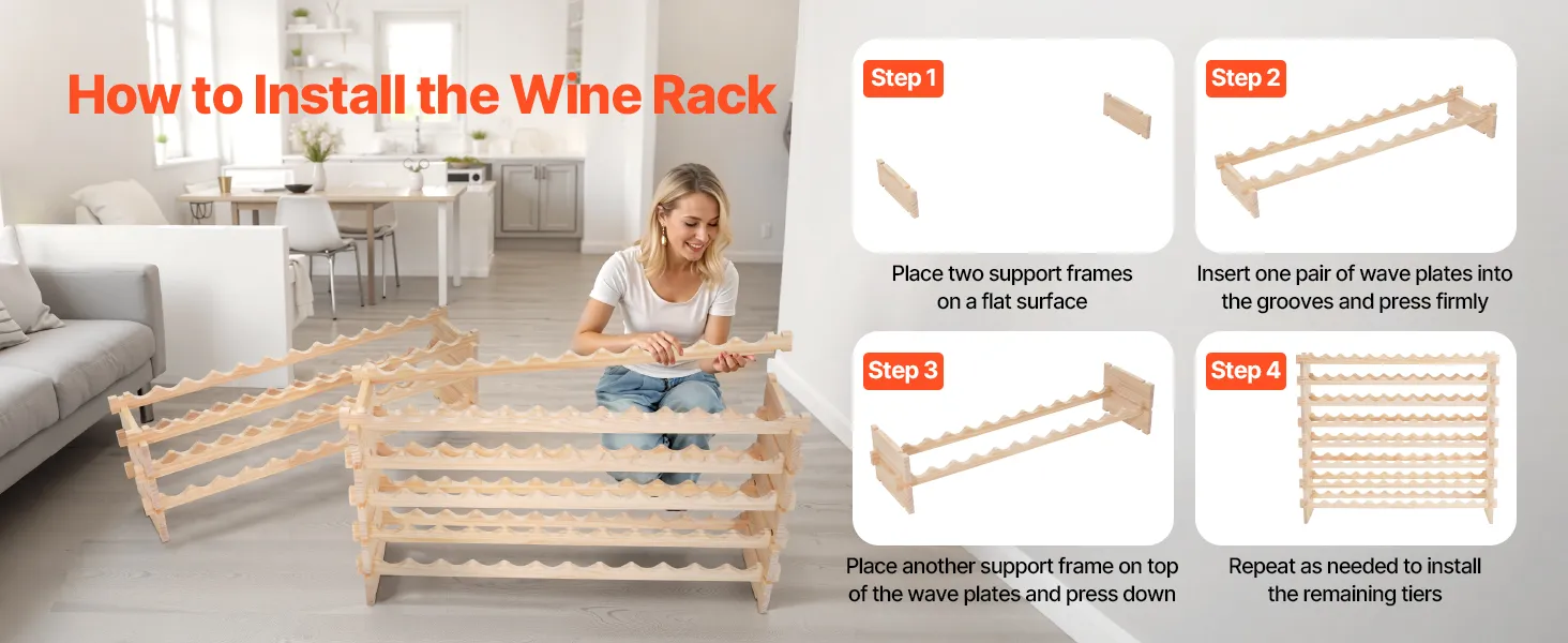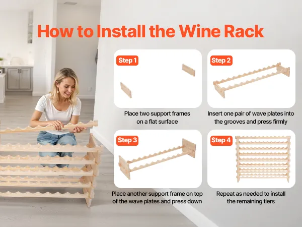 Our wine cellar rack comes with detailed instructions for quick setup—no extra tools or screws required. Simply align the notches and grooves and press to assemble. Even beginners can complete installation in minutes.