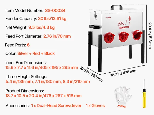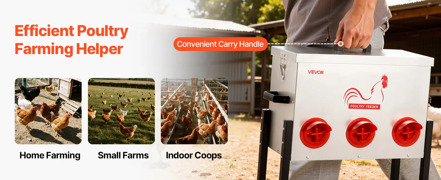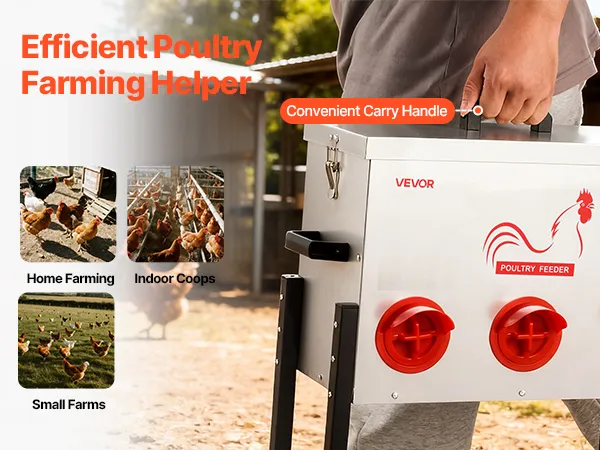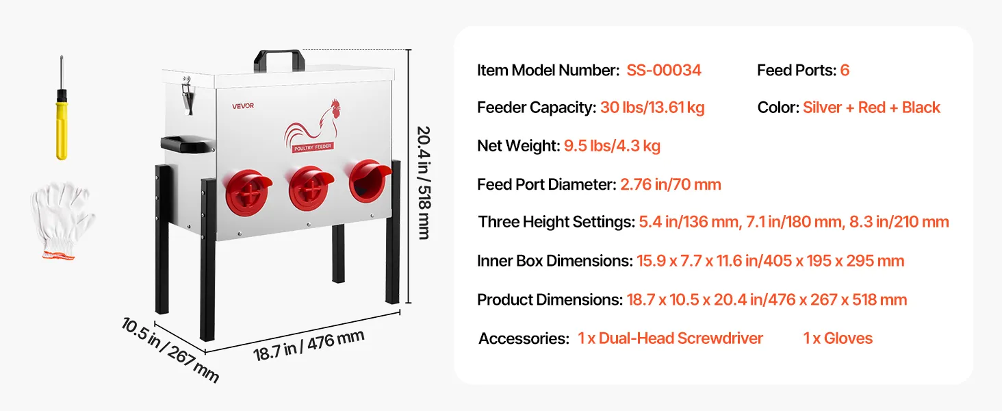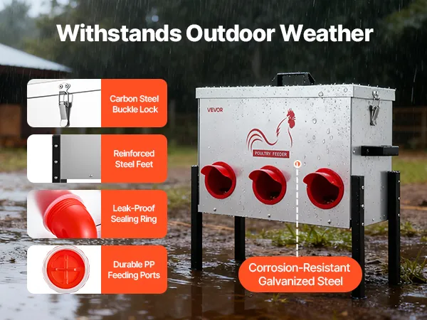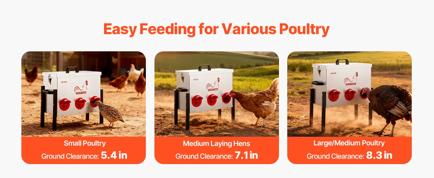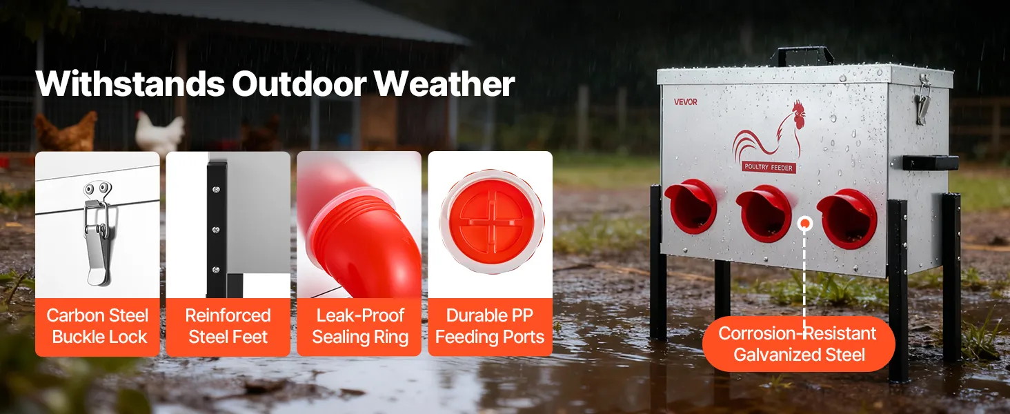 • Durable & Built to Last: Made from galvanized steel with PP feed ports, this waterproof chicken feeder is rust-and corrosion-resistant and easy to clean. Reinforced steel legs suit indoor or outdoor use. With a detailed manual and tools for quick assembly