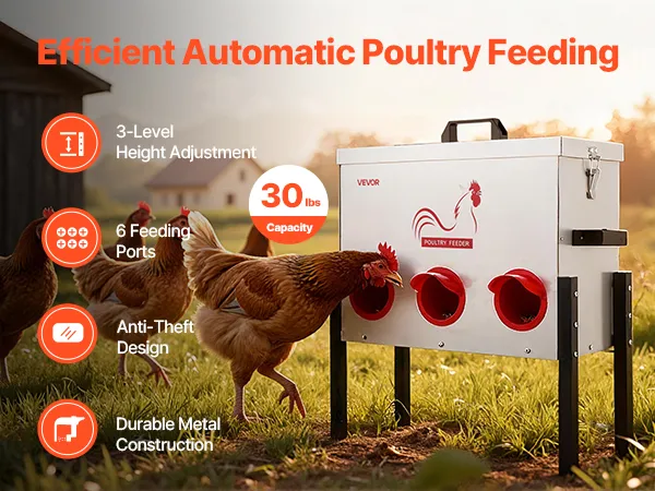 VEVOR Automatic Chicken Feeder, 13.6 kg, 6-Port No-Waste Gravity Feeder, Adjustable Height, Lock Lid, Metal for Poultry