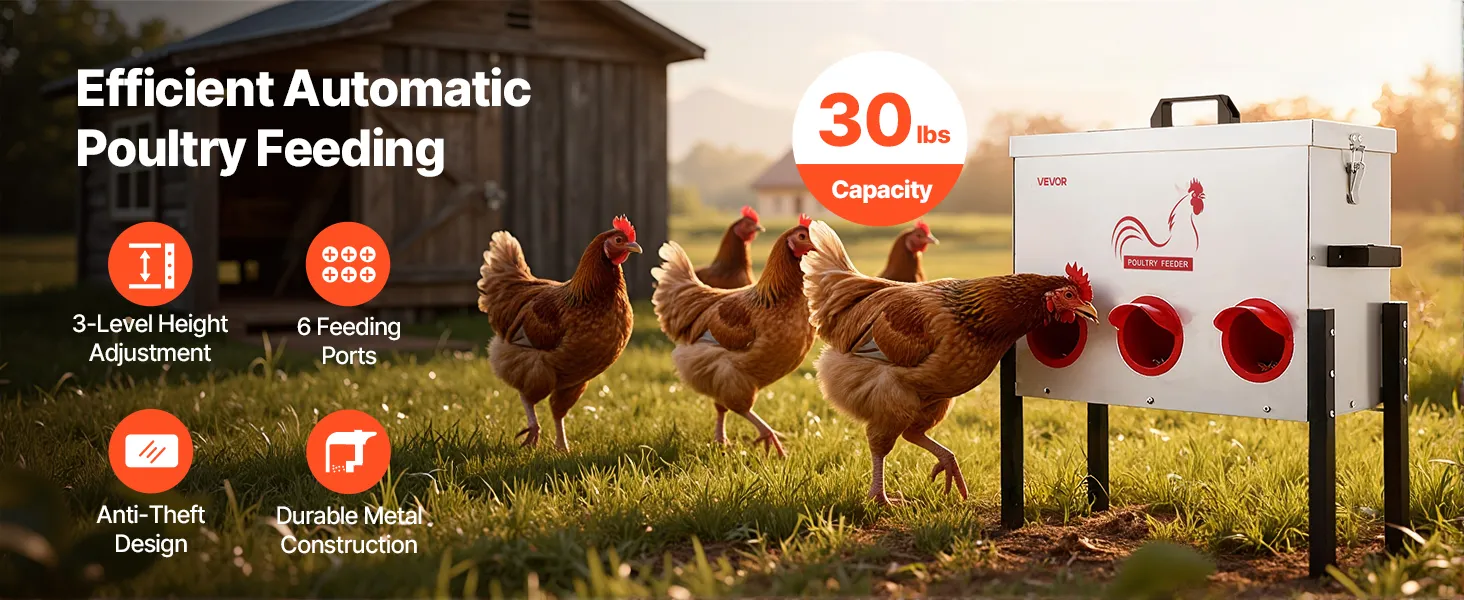 • 30 lbs Large Capacity: This automatic chicken feeder holds 30 lbs of small pellets, crumbs, or crushed feed, providing 12–17 days of feed for 10–12 adult chickens. The 6 feeding ports allow multiple chickens to feed at once, saving time and daily refills
